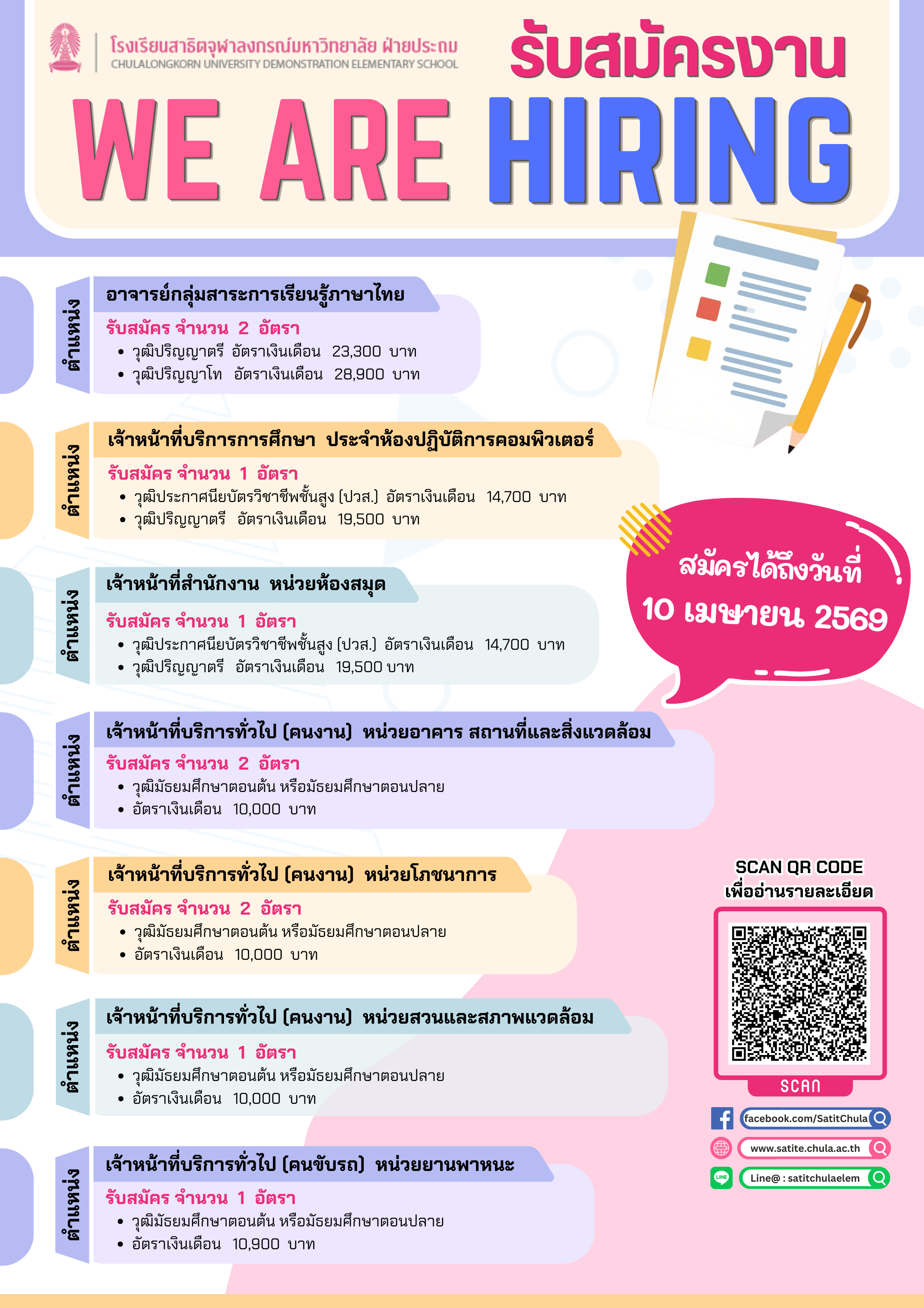 ประกาศขยายเวลารับสมัครงานตำแหน่งต่าง ๆ ดังนี้ สมัครได้ถึงวันที่ 10 เมษายน 2569 Scan QR CODE [...]