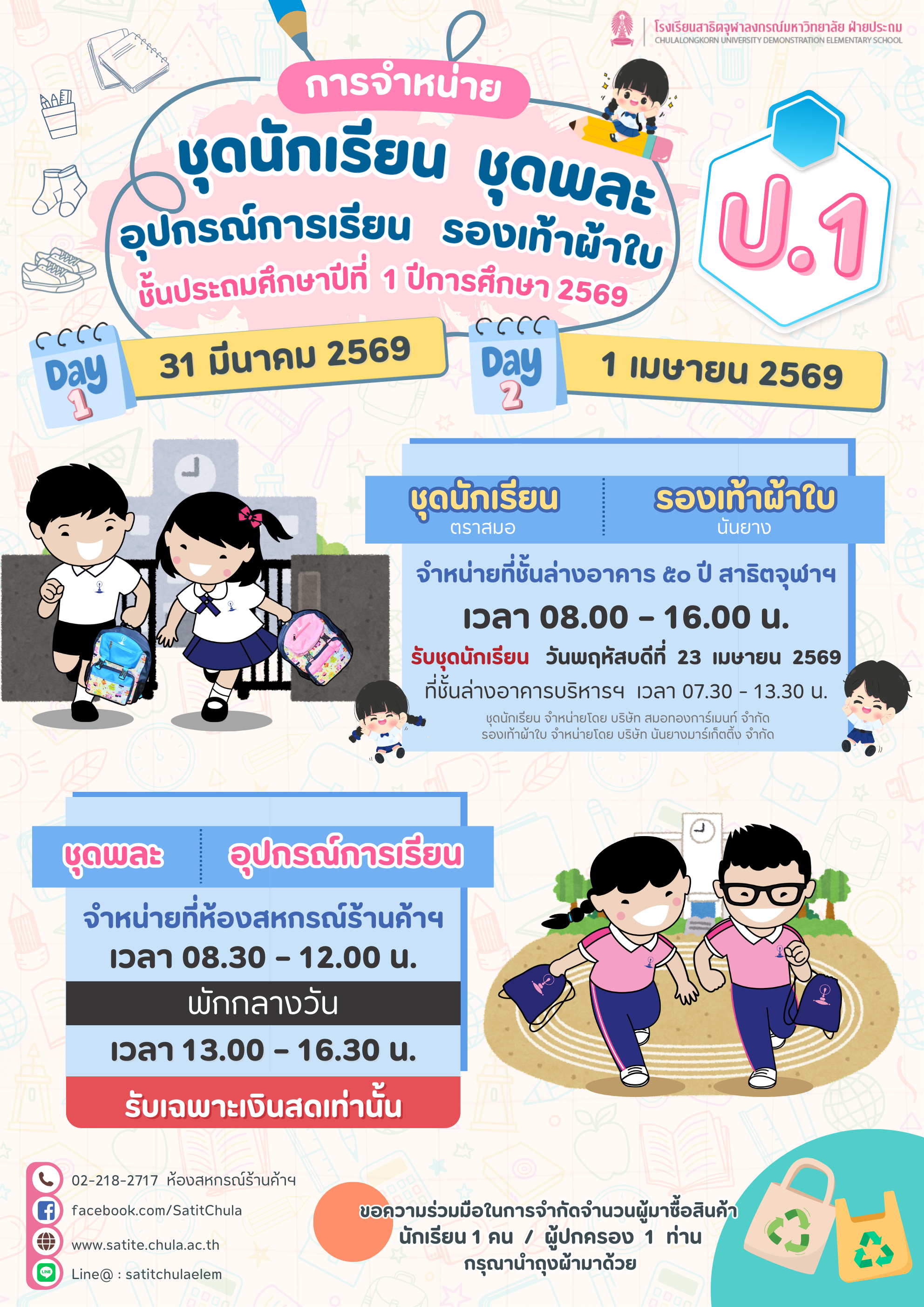 กำหนดการจำหน่ายชุดนักเรียน ชุดพละ อุปกรณ์การเรียน และรองเท้าผ้าใบ สำหรับนักเรียนชั้นประถมศึกษาปีที่ 1 ปีการศึกษา 2569 โรงเรียนสาธิตจุฬาลงกรณ์มหาวิทยาลัย ฝ่ายประถม