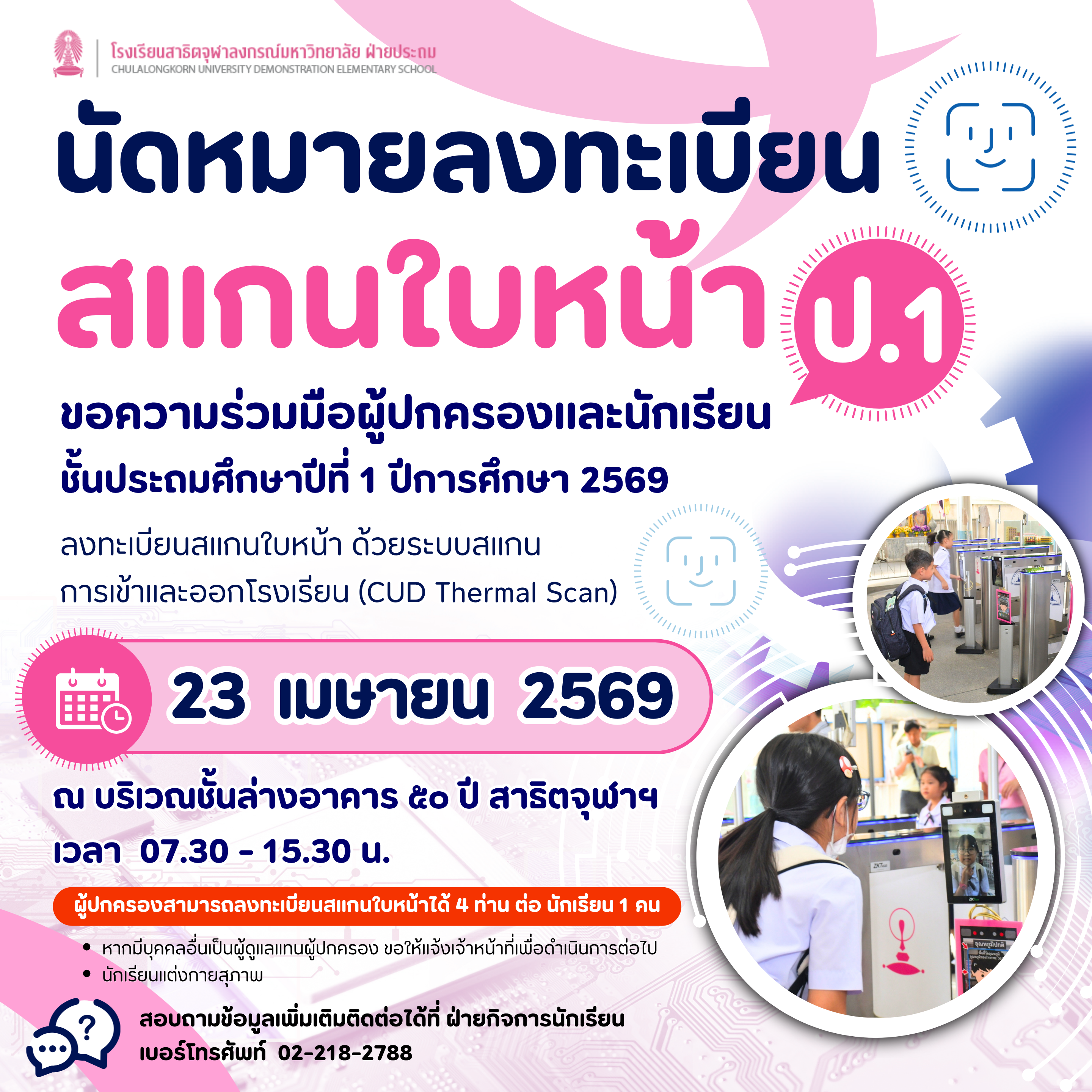 เรียน ผู้ปกครองนักเรียนชั้นประถมศึกษาปีที่ 1 ปีการศึกษา 2569 เรื่อง การนัดหมายลงทะเบียนสแกนใบหน้า ด้วยระบบสแกนการเข้าและออกโรงเรียน CUD Thermal [...]