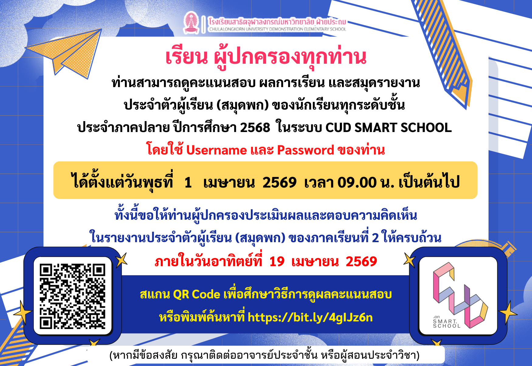 เรียน ผู้ปกครองนักเรียนโรงเรียนสาธิตจุฬาลงกรณ์มหาวิทยาลัย ฝ่ายประถม ท่านสามารถดูคะแนนสอบ ผลการเรียน และสมุดรายงานประจำตัวผู้เรียน (สมุดพก) ของนักเรียนทุกระดับชั้น ประจำภาคปลาย ปีการศึกษา [...]