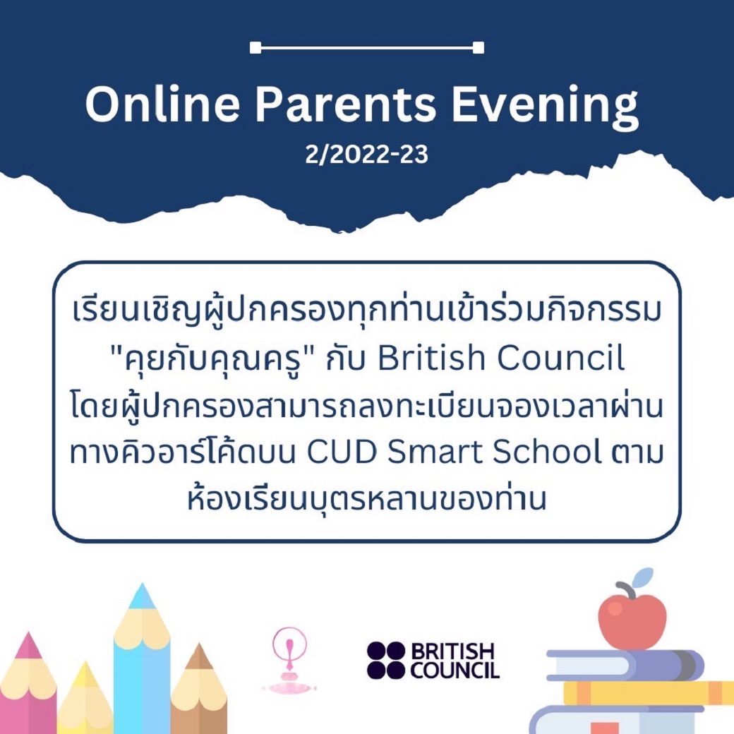 เรียนเชิญผู้ปกครองทุกท่าน เข้าร่วมกิจกรรมคุยกับคุณครูของบริติช เคานซิล (British Council) Online Parents Evening โดยผู้ปกครองสามารถลงทะเบียนจองเวลาทางคิวอาร์โค้ด (QR CODE) บนระบบ CUD Smart School ตามห้องเรียนบุตรหลานของท่าน