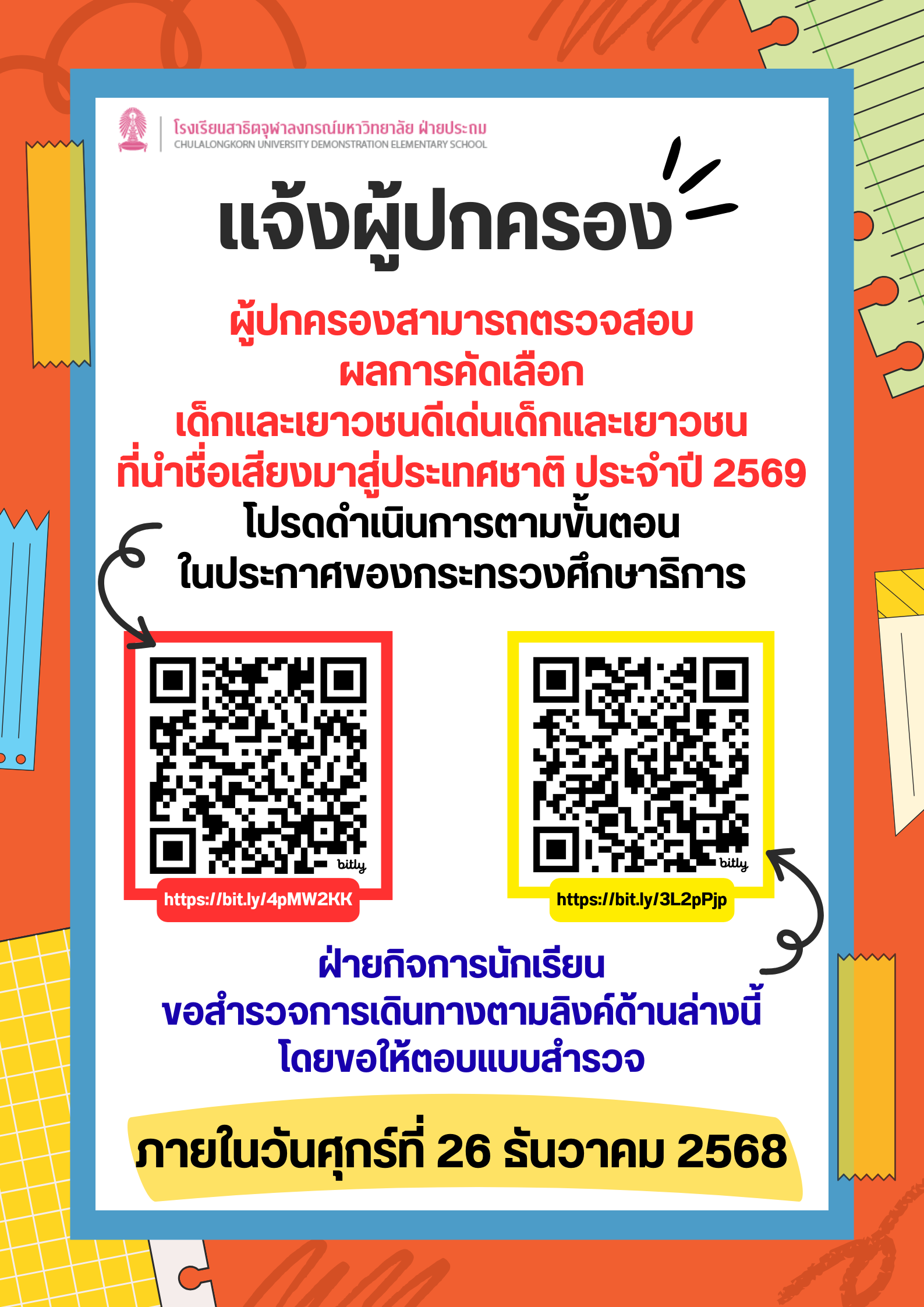 แจ้งผู้ปกครองนักเรียนโรงเรียนสาธิตจุฬาลงกรณ์มหาวิทยาลัย ฝ่ายประถม ผู้ปกครองสามารถตรวจสอบผลการคัดเลือก เด็กและเยาวชนดีเด่นเด็กและเยาวชน ที่นำชื่อเสียงมาสู่ประเทศชาติ ประจำปี 2569