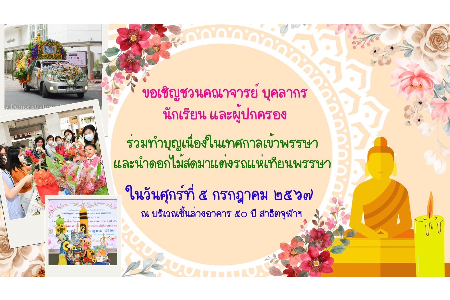 กลุ่มสาระการเรียนรู้สังคมศึกษา ประวัติศาสตร์ หน้าที่พลเมืองและศีลธรรม ขอเชิญชวนคณาจารย์ บุคลากร นักเรียน และผู้ปกครอง ร่วมทำบุญเนื่องในเทศกาลเข้าพรรษา ปีพุทธศักราช 2567 และนำดอกไม้สดมาแต่งรถแห่เทียนพรรษา เพื่อนำถวายที่วัดพระเชตุพนวิมลมังคลารามราชวรมหาวิหาร (วัดโพธิ์) ในวันศุกร์ที่ 5 กรกฎาคม 2567