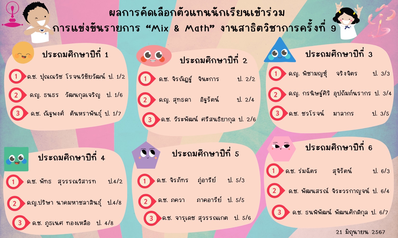 ประกาศผลการคัดเลือกตัวแทนนักเรียนเข้าร่วม การแข่งขันรายการ “Mix & Math” งานสาธิตวิชาการ ครั้งที่ 9