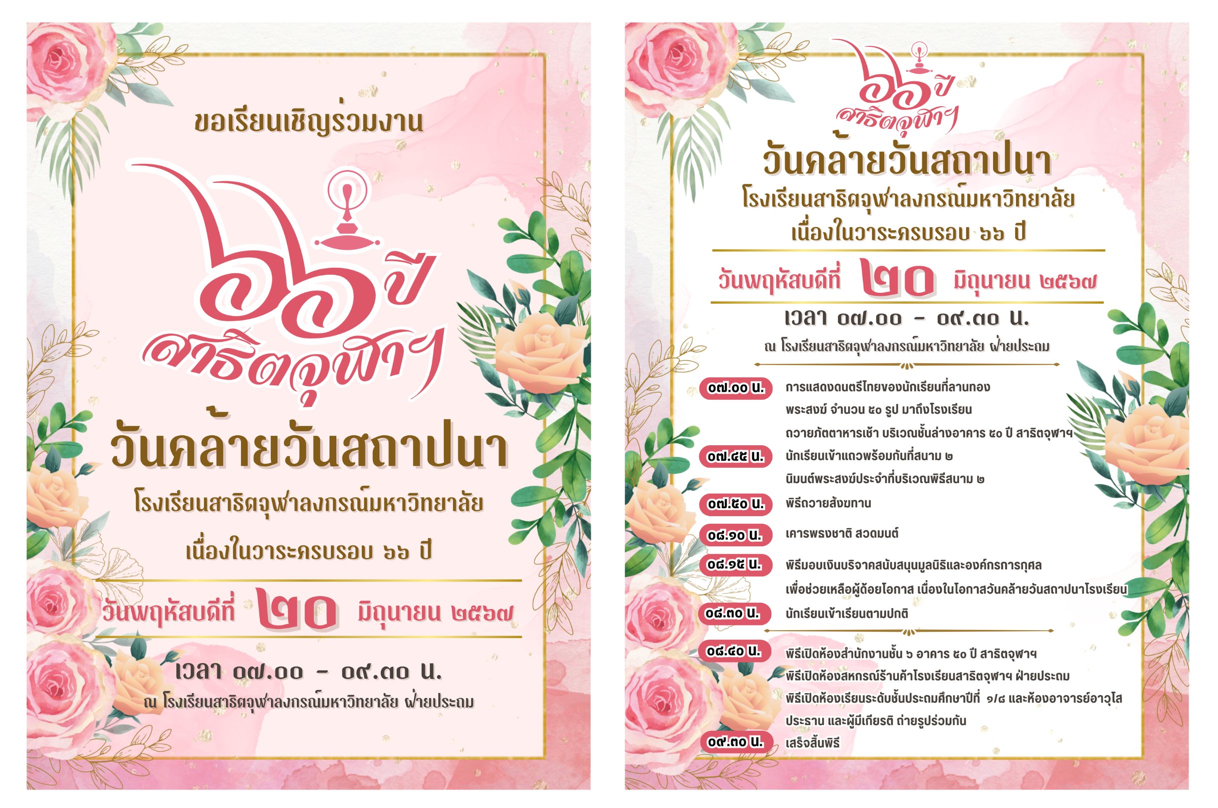 โรงเรียนสาธิตจุฬาลงกรณ์มหาวิทยาลัย ฝ่ายประถม ขอเชิญร่วมงาน วันคล้ายวันสถาปนาโรงเรียนสาธิตจุฬาลงกรณ์มหาวิทยาลัย เนื่องในวาระครบรอบ 66 ปี สาธิตจุฬาฯ
