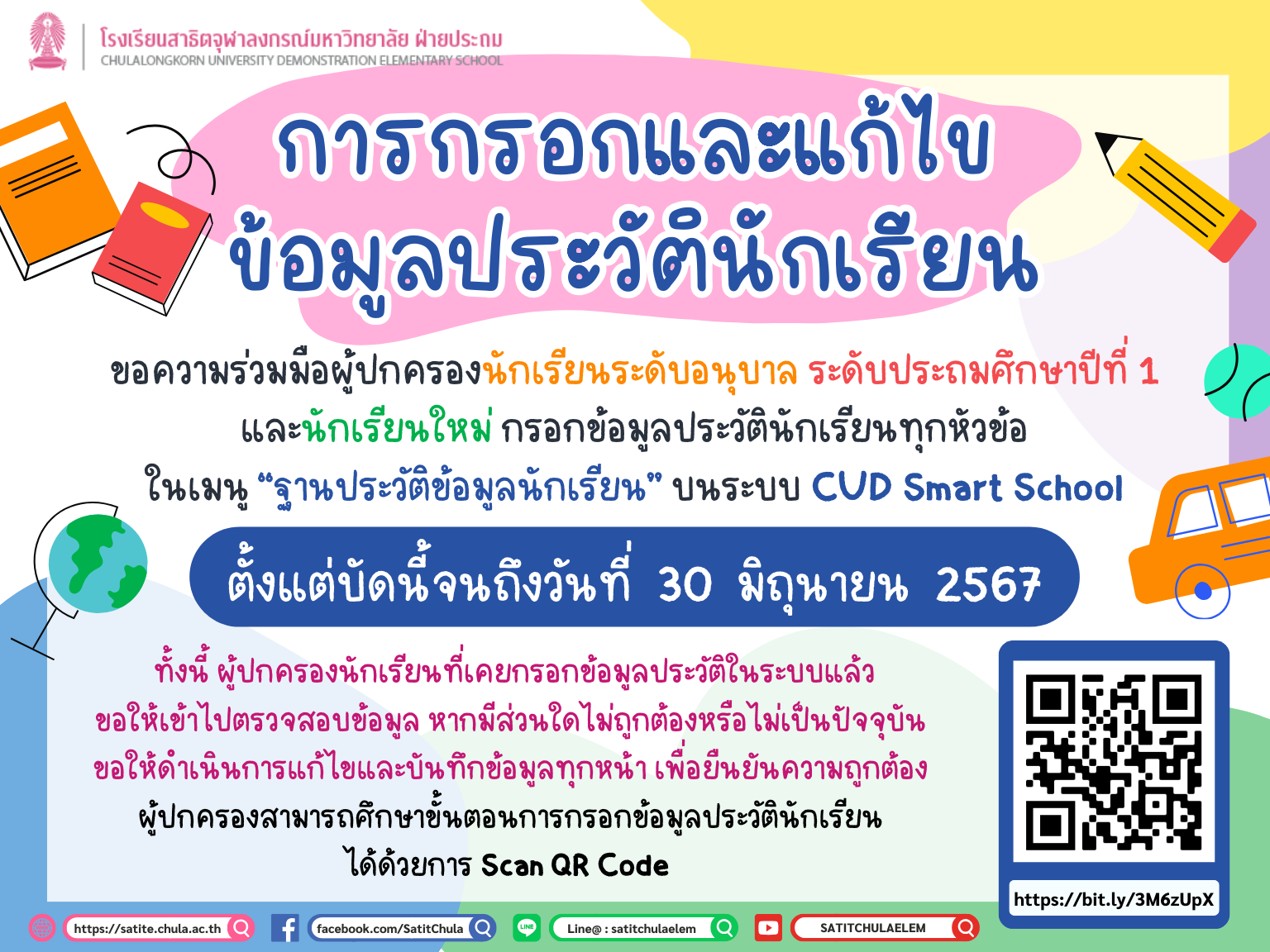 ขอความร่วมมือผู้ปกครองนักเรียนระดับอนุบาล ระดับประถมศึกษาปีที่ 1 และนักเรียนใหม่ กรอกข้อมูลประวัตินักเรียนทุกหัวข้อในเมนู “ฐานประวัติข้อมูลนักเรียน” บนระบบ CUD Smart School ตั้งแต่บัดนี้ จนถึงวันที่ 30 มิถุนายน 2567