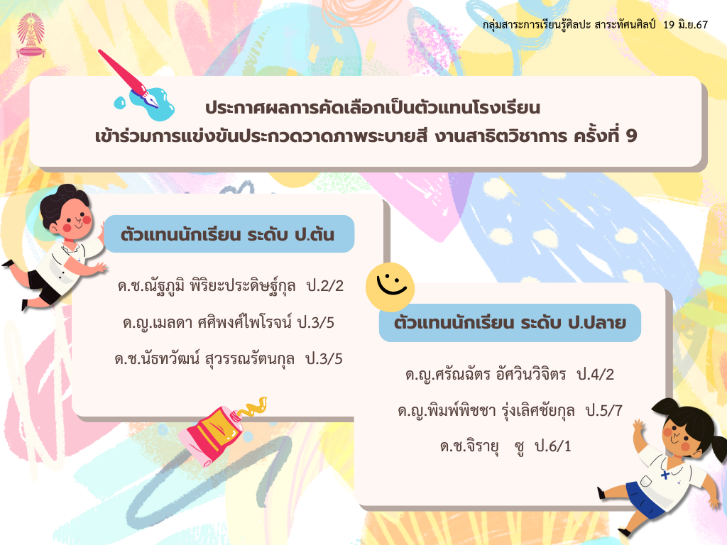 ประกาศผลการคัดเลือกเป็นตัวแทนโรงเรียน เข้าร่วมการแข่งขันประกวดวาดภาพระบายสี งานสาธิตวิชาการ ครั้งที่ 9 หัวข้อ “โรงเรียนสาธิตจุฬาฯ ฝ่ายประถม ในอนาคต”