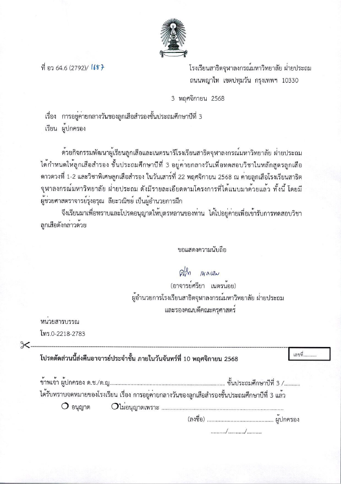 จดหมายโรงเรียน เรื่อง การอยู่ค่ายกลางวันของลูกเสือสำรองชั้นประถมศึกษาปีที่ 3 By Web Master|2025-11-03T09:06:06+07:00November 3, 2025|จดหมายแจ้งจากโรงเรียน| Read More