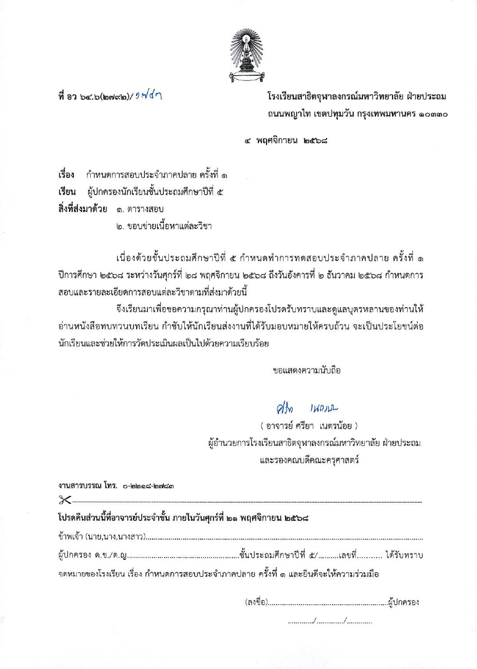 จดหมายโรงเรียน เรื่อง กำหนดการสอบภาคปลาย ครั้งที่ 1 สำหรับนักเรียนระดับชั้นประถมศึกษาปีที่ 5 By Web Master|2025-11-04T10:38:39+07:00November 4, 2025|จดหมายแจ้งจากโรงเรียน| Read More