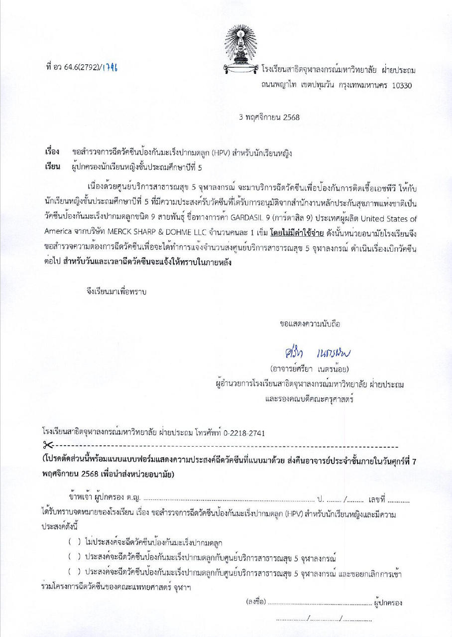 จดหมายโรงเรียน เรื่อง ขอสำรวจการฉีดวัคซีนป้องกันมะเร็งปากมดลูก HPV สำหรับนักเรียนระดับชั้น ป.5 By Web Master|2025-11-03T09:12:18+07:00November 3, 2025|จดหมายแจ้งจากโรงเรียน| Read More