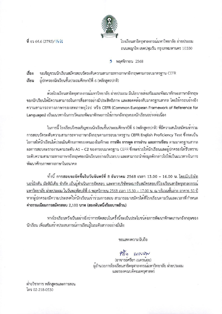 จดหมายโรงเรียน เรื่อง ขอเชิญชวนนักเรียนสมัครสอบวัดระดับความสามารถทางภาษาอังกฤษตามกรอบมาตรฐาน CEFR By Web Master|2025-11-03T09:07:55+07:00November 3, 2025|จดหมายแจ้งจากโรงเรียน| Read More