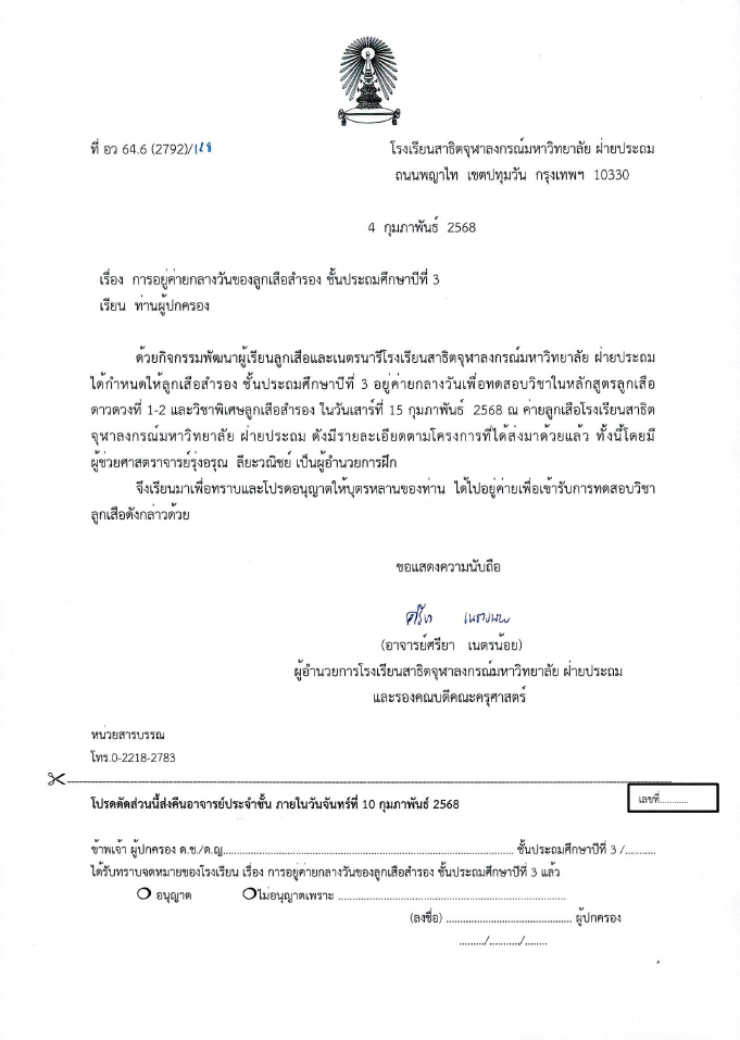 จดหมายโรงเรียน เรื่อง การอยู่ค่ายพักแรมของลูกเสือและเนตรนารี ระดับชั้นประถมศึกษาปีที่ 6 By Web Master|2025-02-11T13:05:53+07:00February 11, 2025|จดหมายแจ้งจากโรงเรียน| Read More