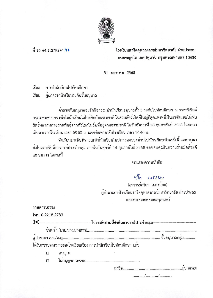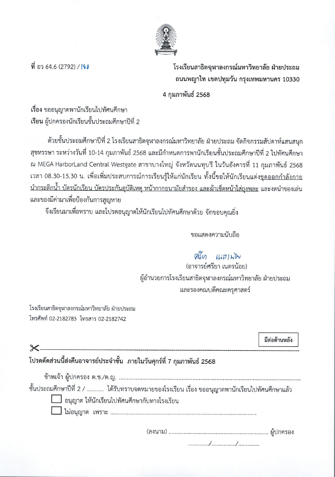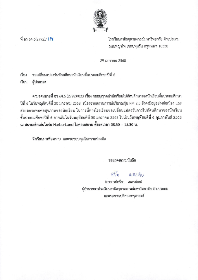 จดหมายโรงเรียน เรื่อง ขอเปลี่ยนแปลงวันทัศนศึกษานักเรียนระดับชั้นประถมปีที่ 6 By Web Master|2025-01-29T09:24:49+07:00January 29, 2025|จดหมายแจ้งจากโรงเรียน| Read More