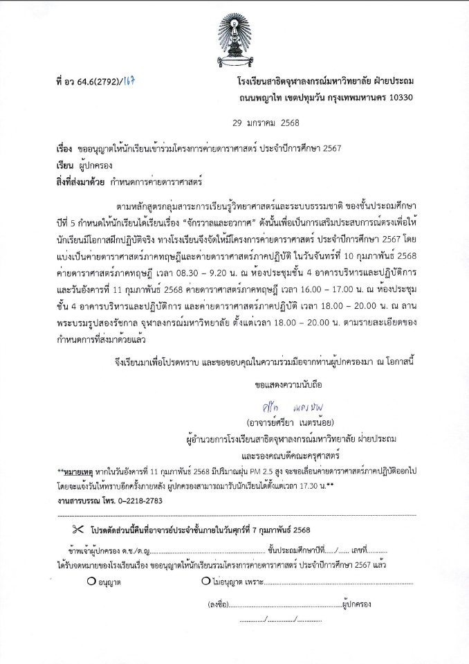 จดหมายโรงเรียน เรื่อง ขออนุญาตนำนักเรียนเข้าร่วมโครงการค่ายดาราศาสตร์ ประจำปีการศึกษา 2567 By Web Master|2025-01-30T13:04:37+07:00January 30, 2025|จดหมายแจ้งจากโรงเรียน| Read More