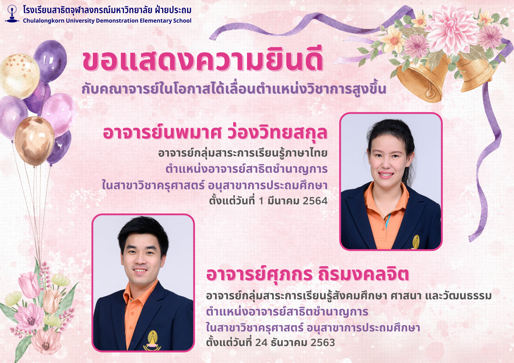 โรงเรียนสาธิตจุฬาลงกรณ์มหาวิทยาลัย ฝ่ายประถม ขอแสดงความยินดีกับคณาจารย์ในโอกาสได้เลื่อนตำแหน่งวิชาการสูงขึ้น อาจารย์นพมาศ ว่องวิทยสกุล อาจารย์กลุ่มสาระการเรียนรู้ภาษาไทย ตำแหน่งอาจารย์สาธิตชำนาญการ ในสาขาวิชาครุศาสตร์ อนุสาขาการประถมศึกษา ตั้งแต่วันที่ [...]