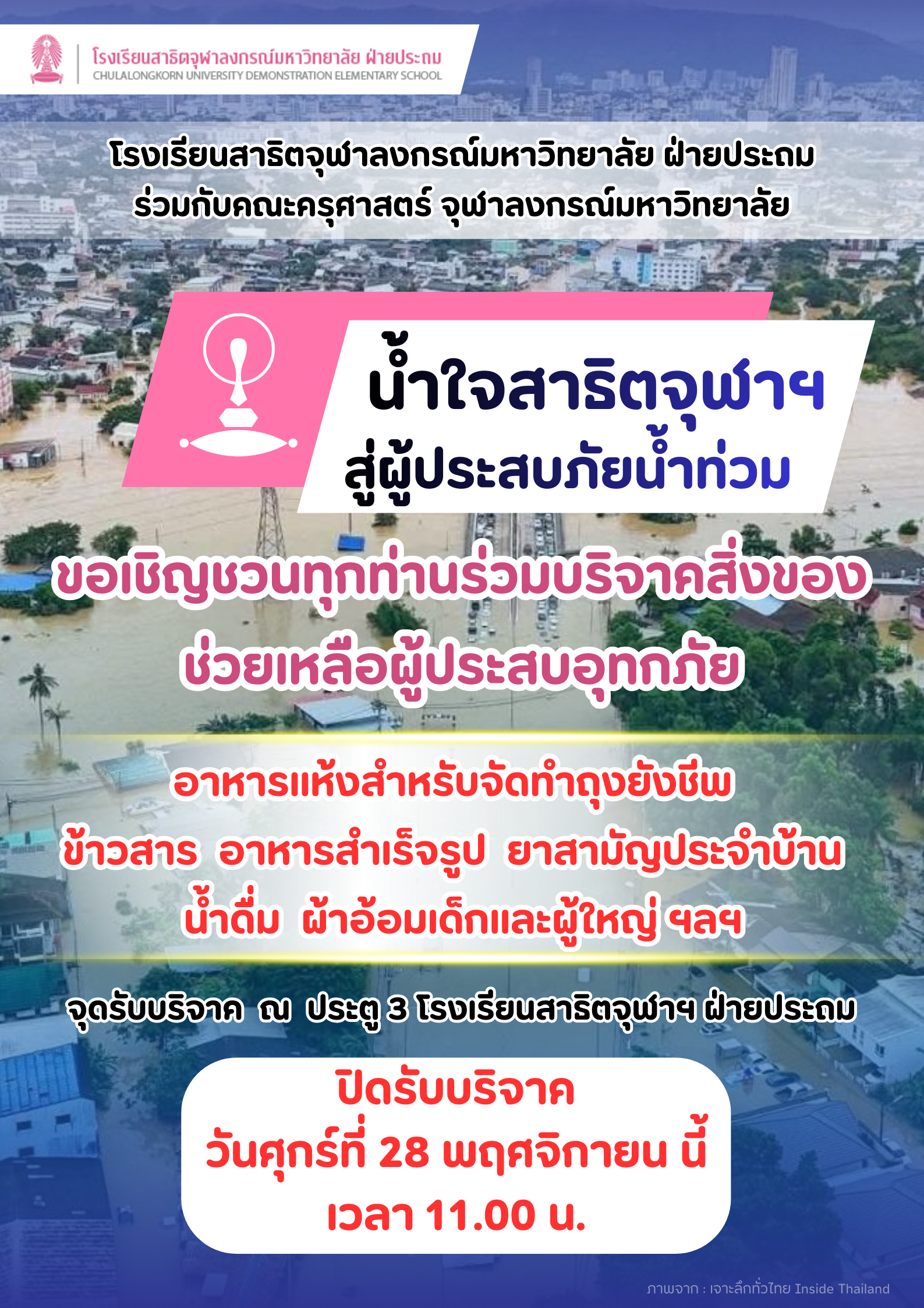 โรงเรียนสาธิตจุฬาลงกรณ์มหาวิทยาลัย ฝ่ายประถม ร่วมกับคณะครุศาสตร์ จุฬาลงกรณ์มหาวิทยาลัย น้ำใจสาธิตจุฬาฯ สู่ผู้ประสบภัยน้ำท่วม ครั้งที่ 2 ขอเชิญชวนทุกท่านร่วมบริจาคสิ่งของช่วยเหลือผู้ประสบอุทกภัย เสื้อผ้าหรืออุปกรณ์ทำความสะอาด [...]