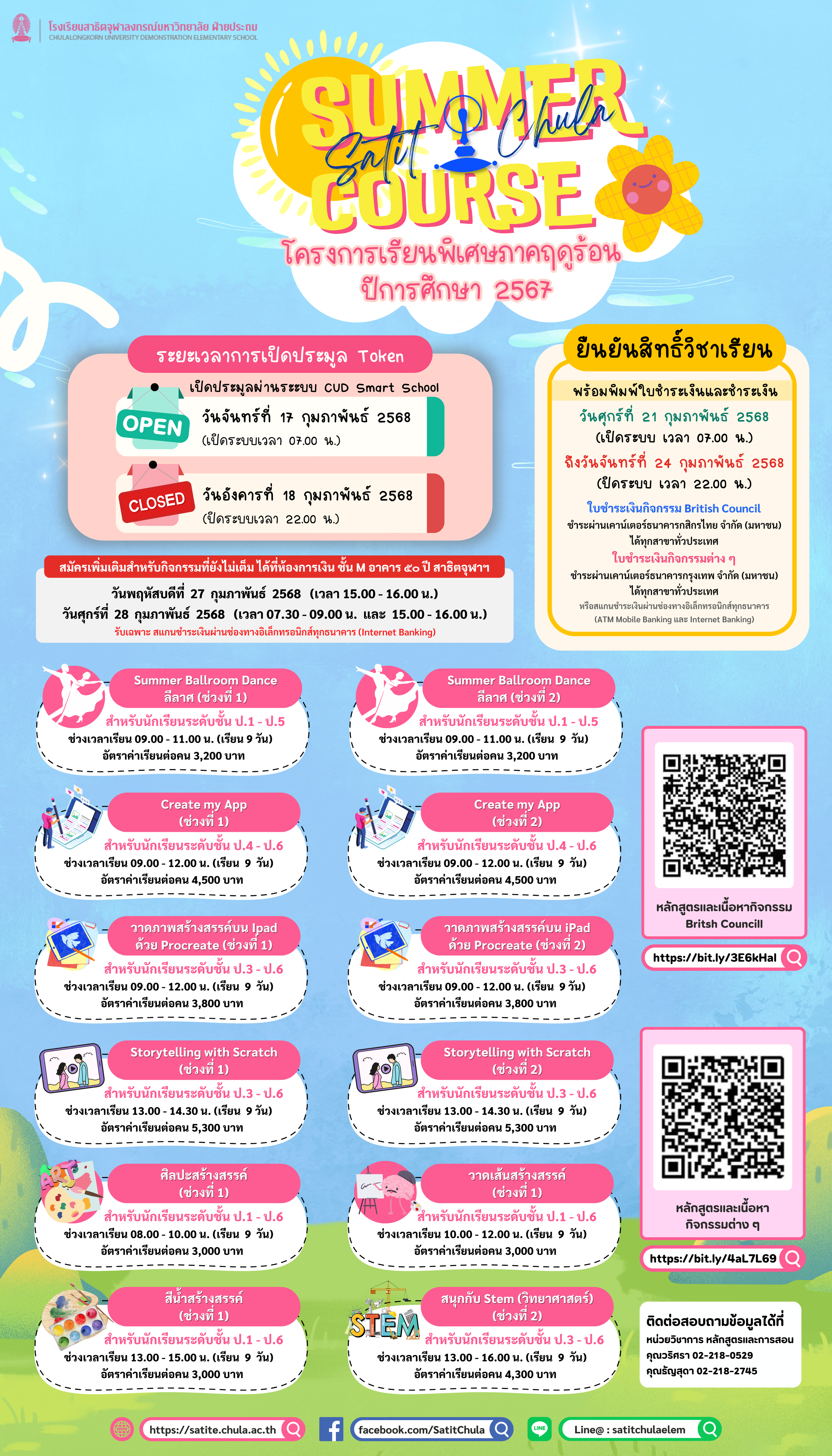 โรงเรียนสาธิตจุฬาลงกรณ์มหาวิทยาลัย ฝ่ายประถม ขอเชิญชวนนักเรียนระดับชั้นประถมศึกษาปีที่ 1 - 6 สมัครเข้าร่วมโครงการเรียนพิเศษ ภาคฤดูร้อน ปีการศึกษา 2567 [...]