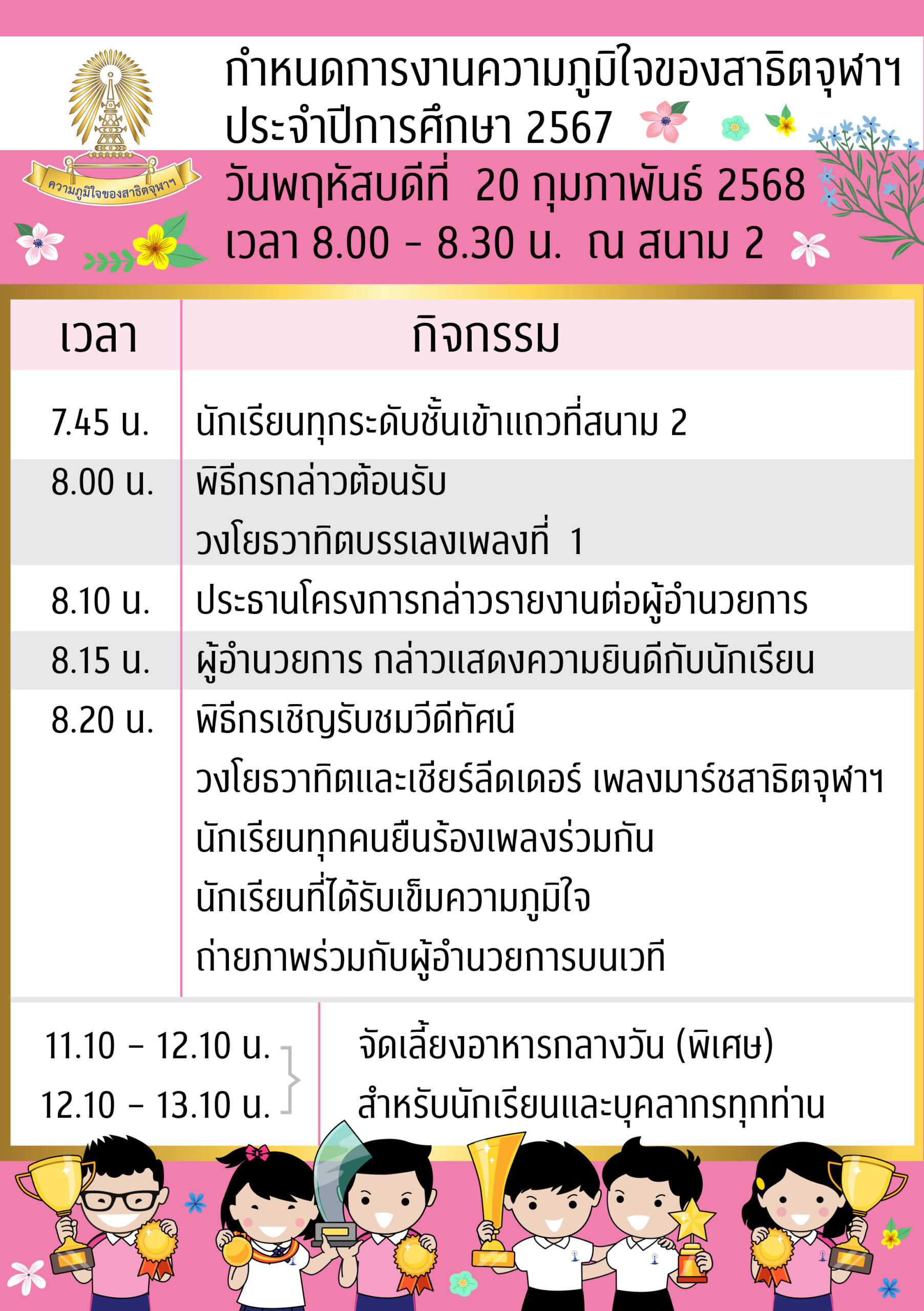 โรงเรียนสาธิตจุฬาลงกรณ์มหาวิทยาลัย ฝ่ายประถม กำหนดจัด "งานความภูมิใจของสาธิตจุฬาฯ ปีการศึกษา 2567" ในวันพฤหัสบดีที่ 20 กุมภาพันธ์ 2568 [...]