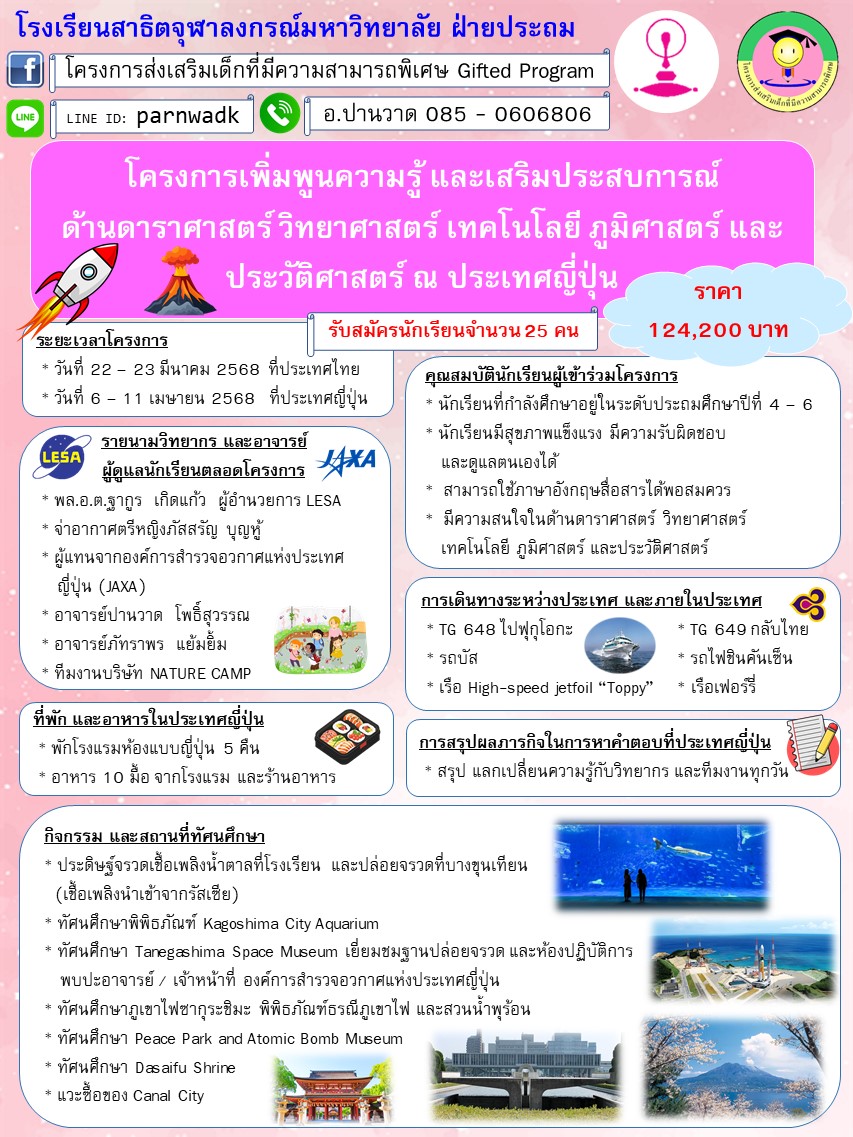 โครงการส่งเสริมเด็กที่มีความสามารถพิเศษ (Gifted Program) โรงเรียนสาธิตจุฬาลงกรณ์มหาวิทยาลัย ฝ่ายประถม เปิดรับสมัครนักเรียนชั้นประถมศึกษาปีที่ 4-6 เข้าร่วมโครงการเพิ่มพูนความรู้และเสริมประสบการณ์ ด้านดาราศาสตร์ วิทยาศาสตร์ [...]