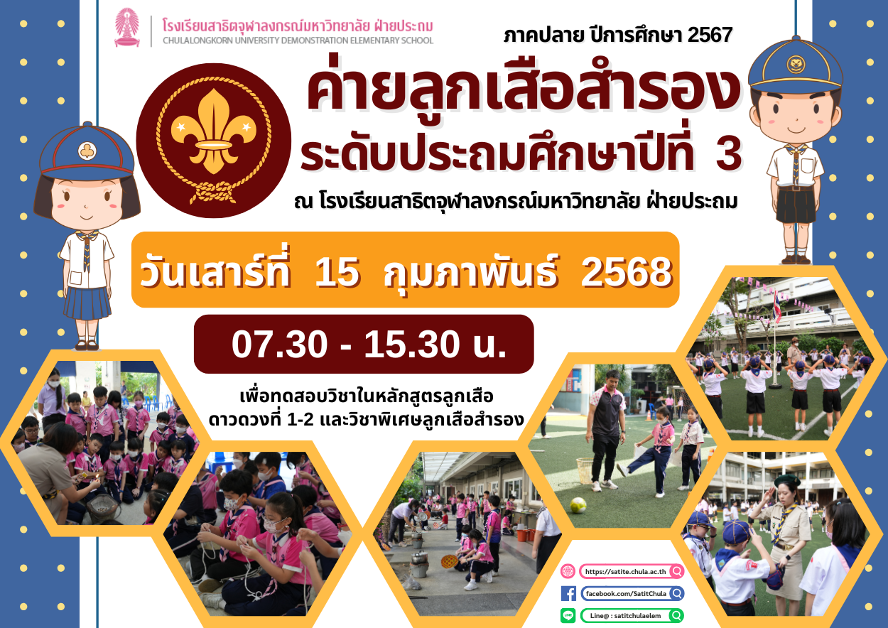 เรียน ผู้ปกครองนักเรียนโรงเรียนสาธิตจุฬาลงกรณ์มหาวิทยาลัย ฝ่ายประถม เรื่อง การอยู่ค่ายกลางวันของลูกเสือสำรองระดับชั้นประถมศึกษาปีที่ 3 ภาคปลาย ปีการศึกษา 2567 [...]