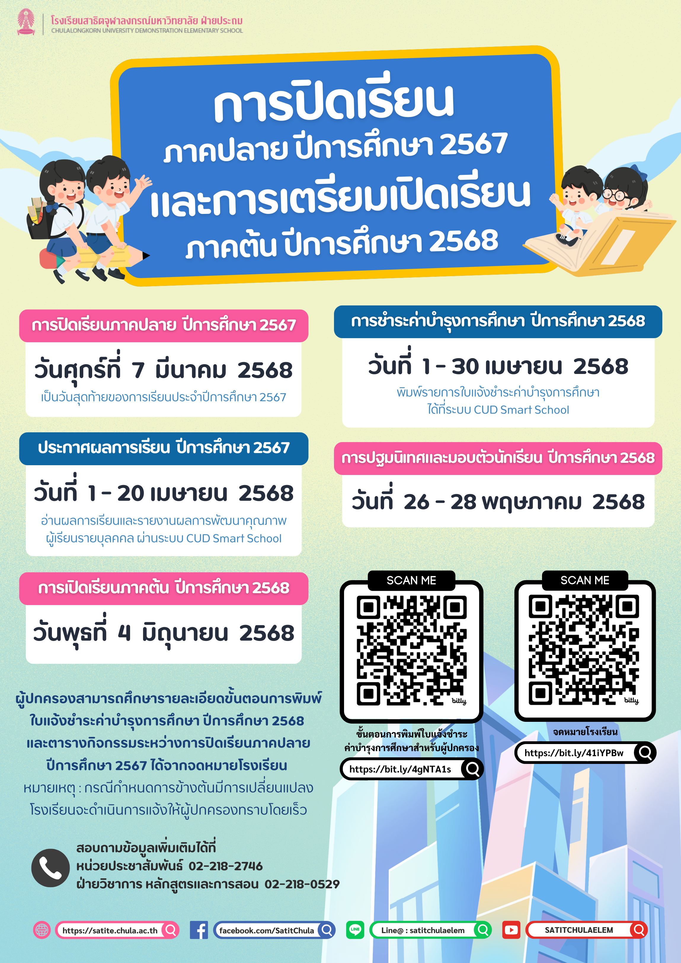 เรียน ผู้ปกครองนักเรียนโรงเรียนสาธิตจุฬาลงกรณ์มหาวิทยาลัย ฝ่ายประถม เรื่อง การปิดเรียนภาคปลาย ปีการศึกษา 2567 และเตรียมเปิดเรียนภาคต้น ปีการศึกษา 2568 [...]