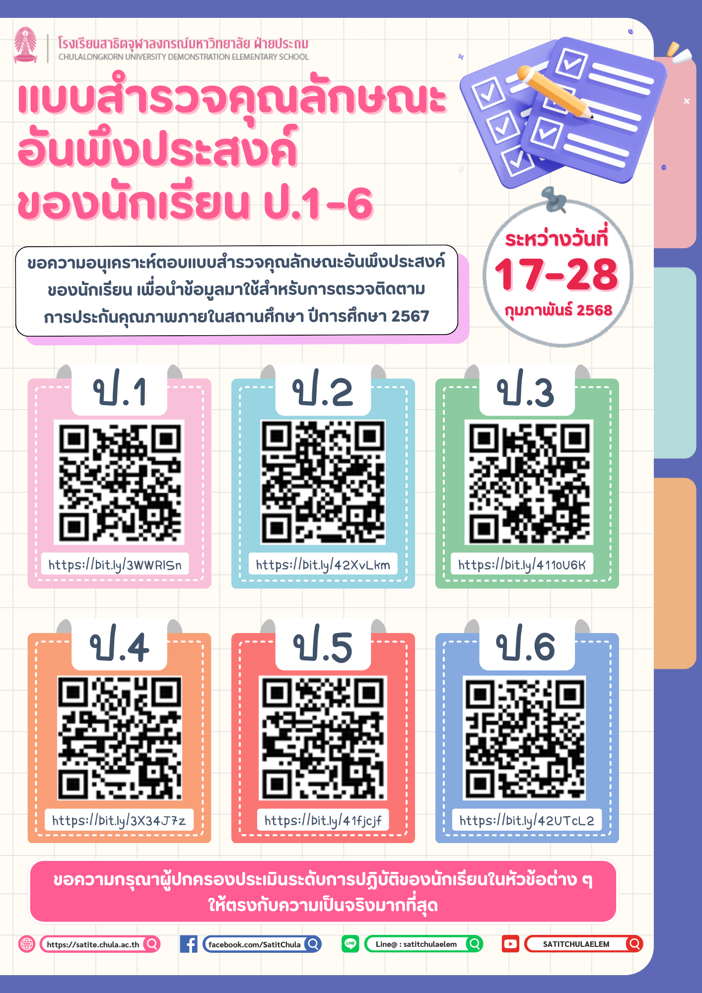 เรียน ผู้ปกครองนักเรียนระดับชั้นประถมศึกษาปีที่ 1-6 เรื่อง ขอความอนุเคราะห์ตอบแบบสำรวจคุณลักษณะอันพึงประสงค์ของนักเรียน โรงเรียนสาธิตจุฬาลงกรณ์มหาวิทยาลัย ฝ่ายประถม ขอความร่วมมือจากท่านผู้ปกครองตอบแบบสำรวจคุณลักษณะอันพึงประสงค์ของนักเรียนในความดูแลของท่าน เพื่อนำข้อมูลมาใช้สำหรับการตรวจติดตามการประกันคุณภาพภายในสถานศึกษา ปีการศึกษา [...]