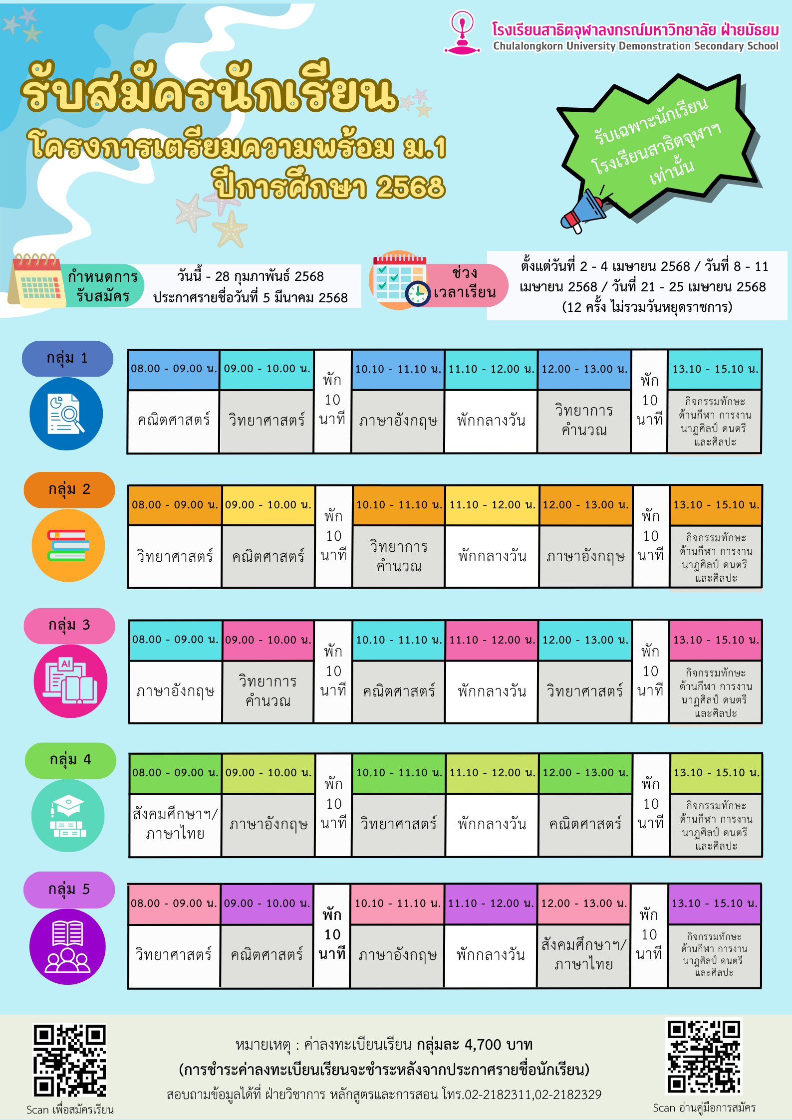 โรงเรียนสาธิตจุฬาลงกรณ์มหาวิทยาลัย ฝ่ายมัธยม เปิดรับสมัครนักเรียนโครงการเตรียมความพร้อม ม.1 ปีการศึกษา 2568