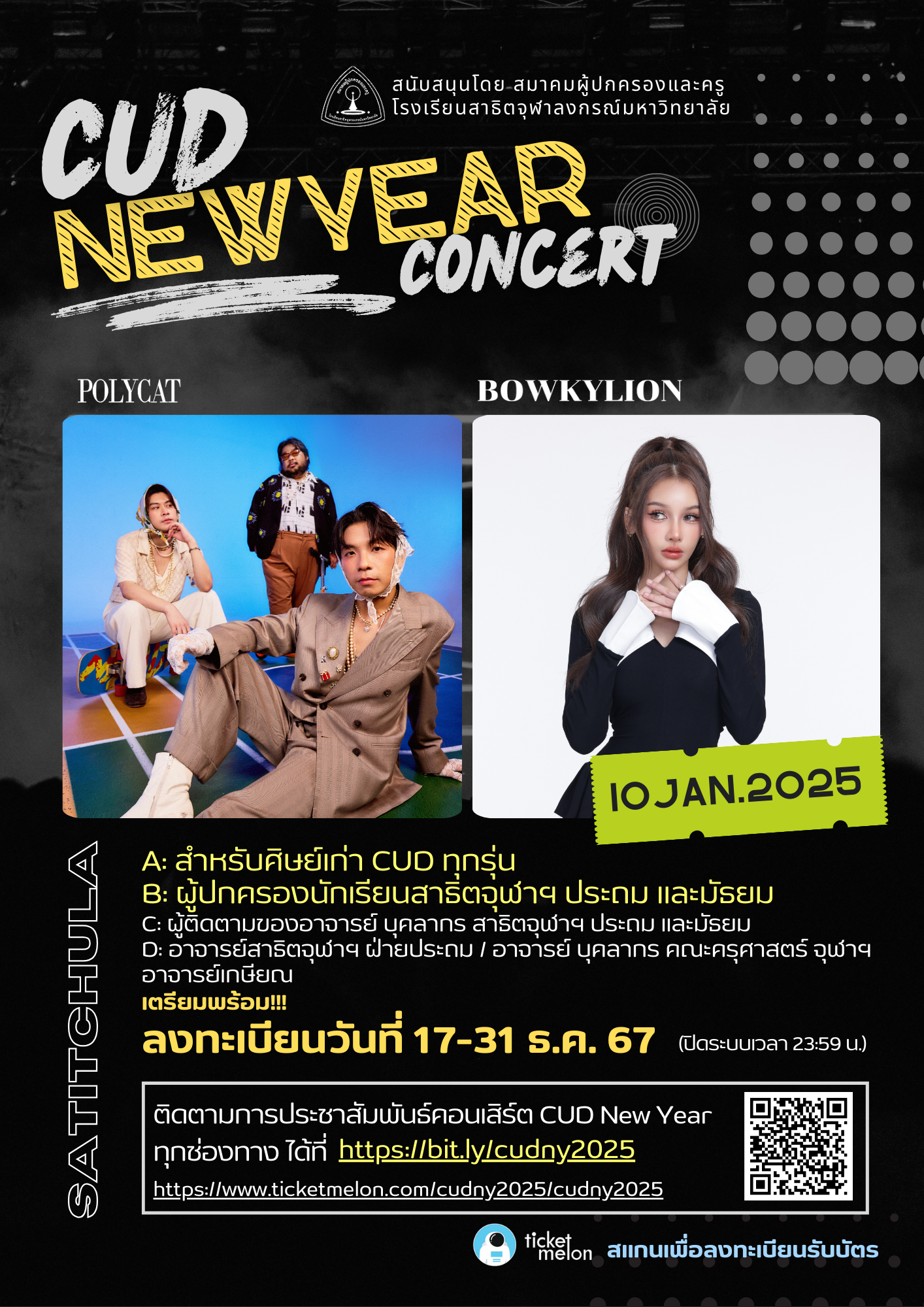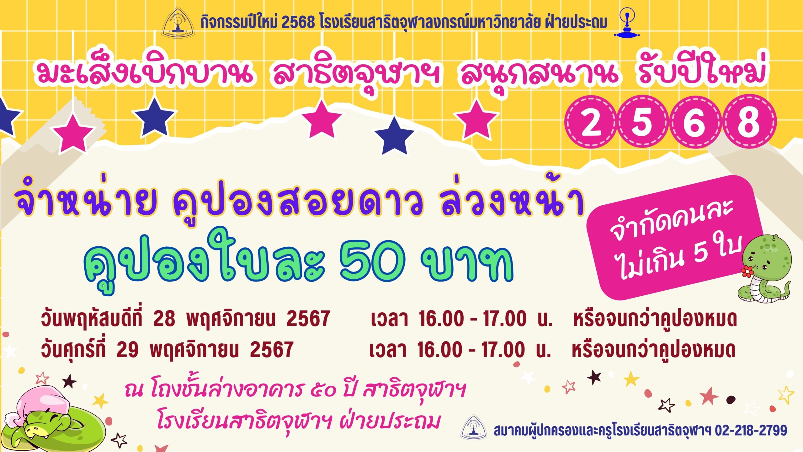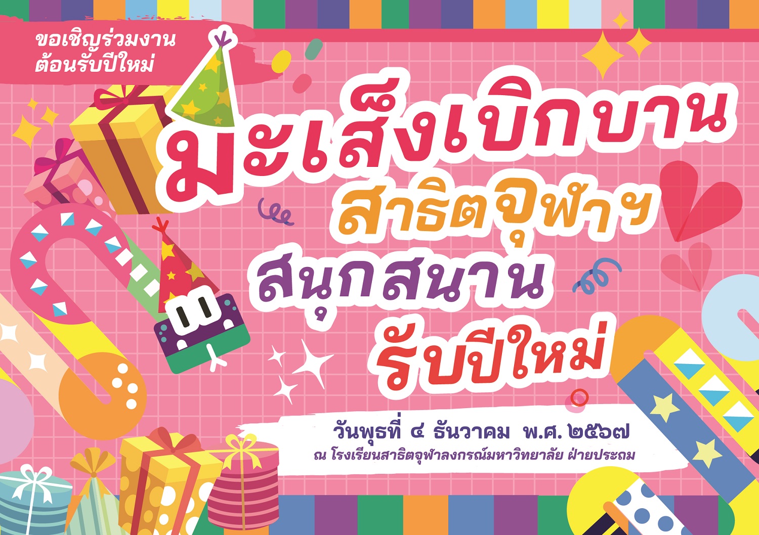 เตรียมพบกับ งานปีใหม่ รื่นเริง อิ่มอร่อย ชมดนตรี ประจำปี 2568 “ปีมะเส็งพาโชคดี สุขทวี ปีใหม่สาธิตจุฬาฯ” ในวันศุกร์ที่ 10 มกราคม 2568 ณ โรงเรียน สาธิตจุฬาฯ ฝ่ายมัธยม