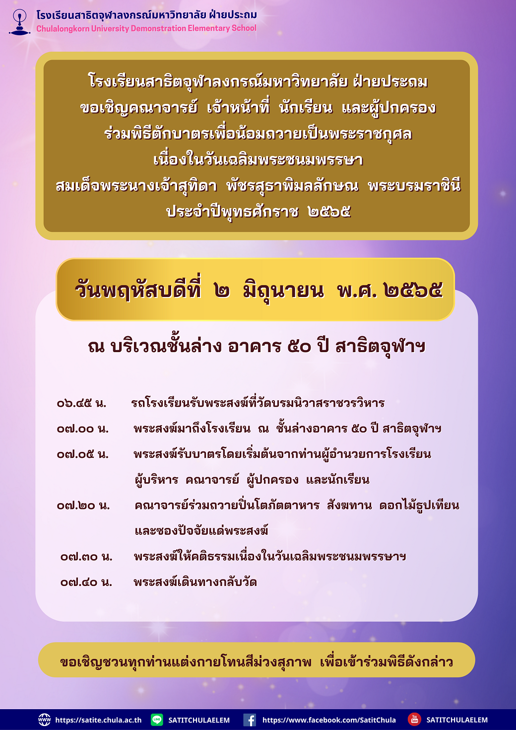 ขอเชิญคณาจารย์ เจ้าหน้าที่ นักเรียน และผู้ปกครอง ร่วมพิธีตักบาตรเพื่อน้อมถวายเป็นพระราชกุศลเนื่องในวันเฉลิมพระชนมพรรษา สมเด็จพระนางเจ้าสุทิดา พัชรสุธาพิมลลักษณ พระบรมราชินี ประจำปีพุทธศักราช 2565