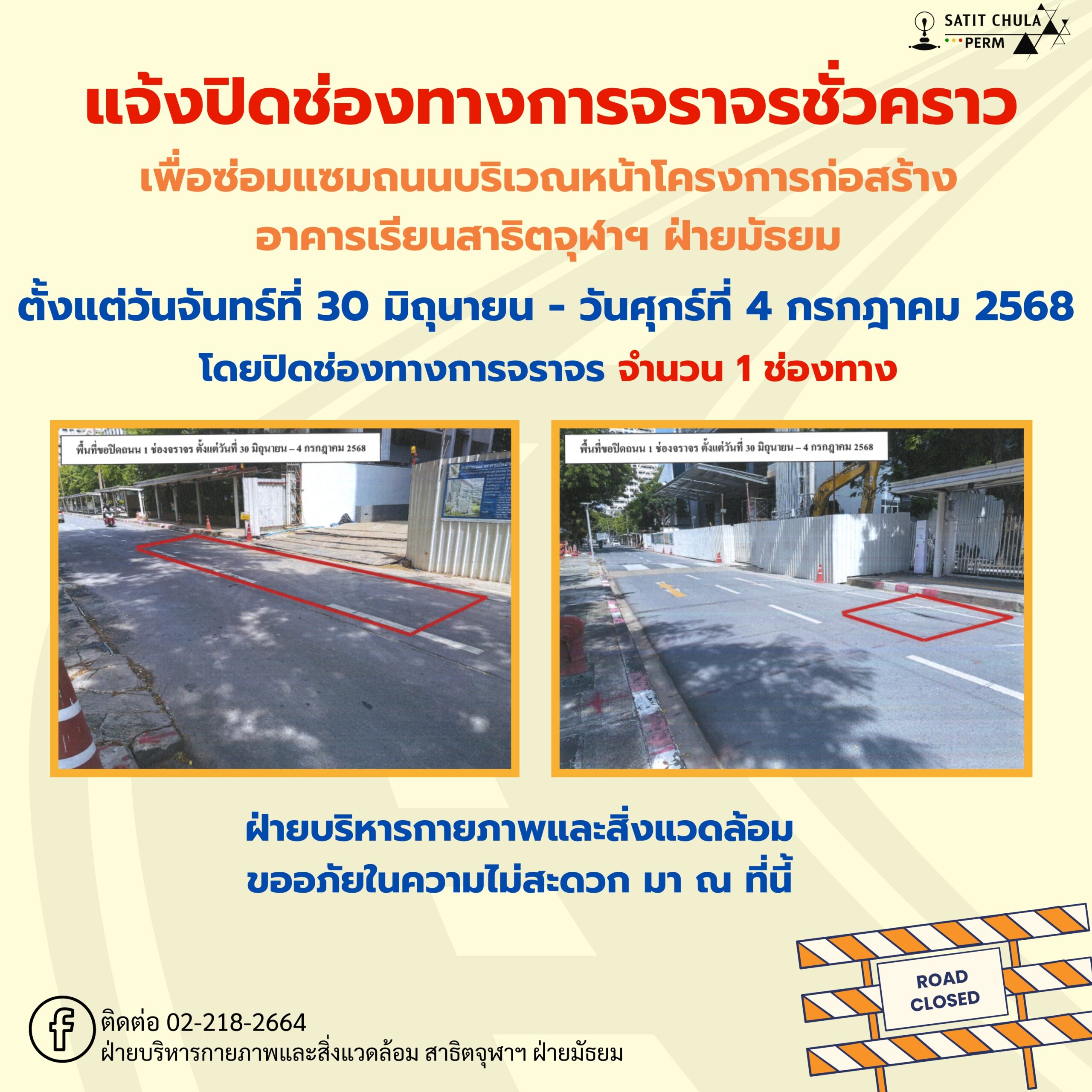 โรงเรียนสาธิตจุฬาลงกรณ์มหาวิทยาลัย ฝ่ายมัธยม ขอแจ้งปิดช่องการจราจรชั่วคราว เพื่อซ่อมแซมถนนบริเวณหน้าโครงการก่อสร้าง อาคารเรียนโรงเรียนสาธิตจุฬาฯ ฝ่ายมัธยม