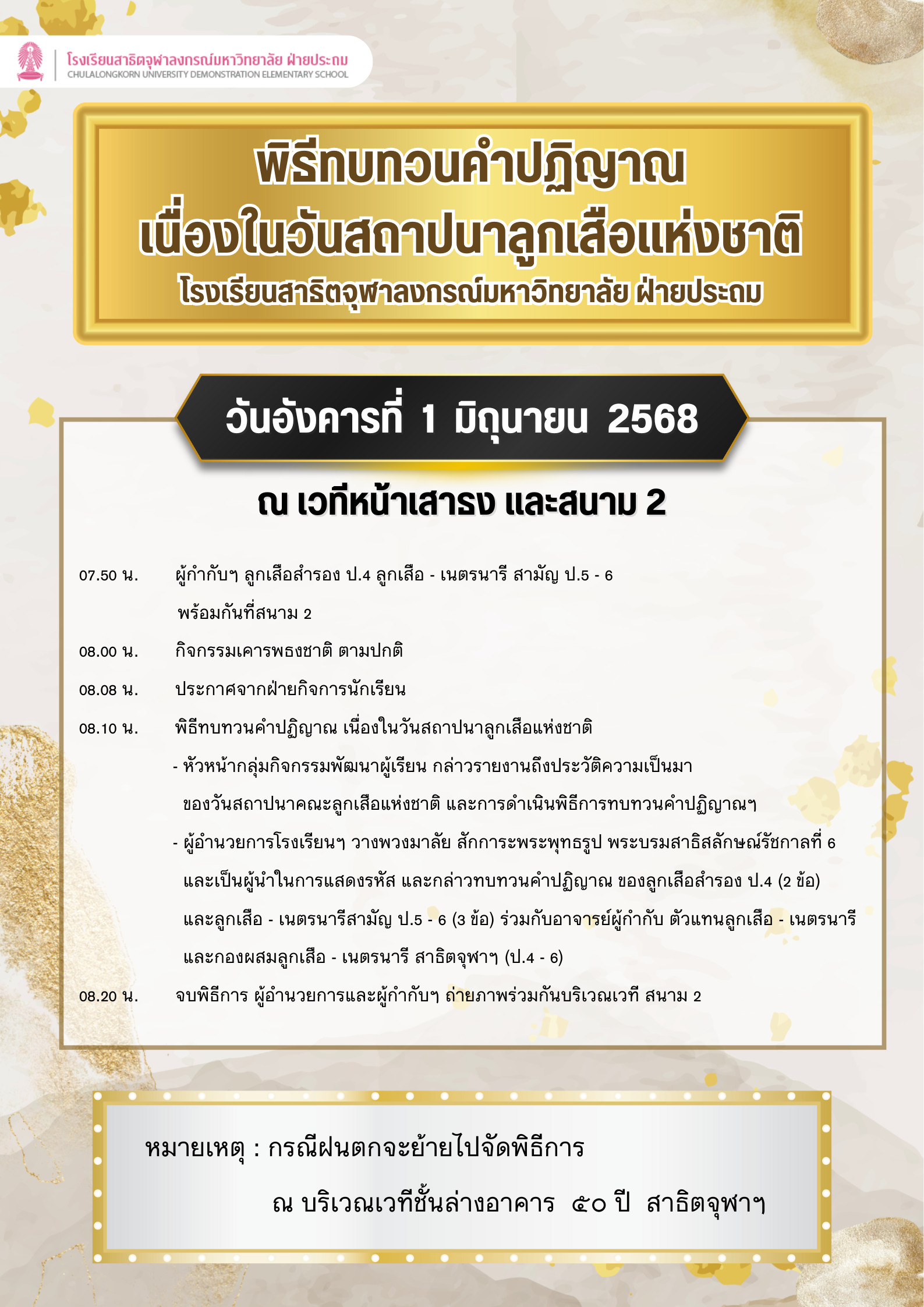 โรงเรียนสาธิตจุฬาลงกรณ์มหาวิทยาลัย ฝ่ายประถม กำหนดจัดพิธีทบทวนคำปฏิญาณ ของลูกเสือสำรองระดับชั้นประถมศึกษาปีที่ 4 และลูกเสือ – เนตรนารี สามัญ ระดับชั้นประถมศึกษาปีที่ 5 – 6 วันคล้ายวันสถาปนาคณะลูกเสือแห่งชาติ 2568