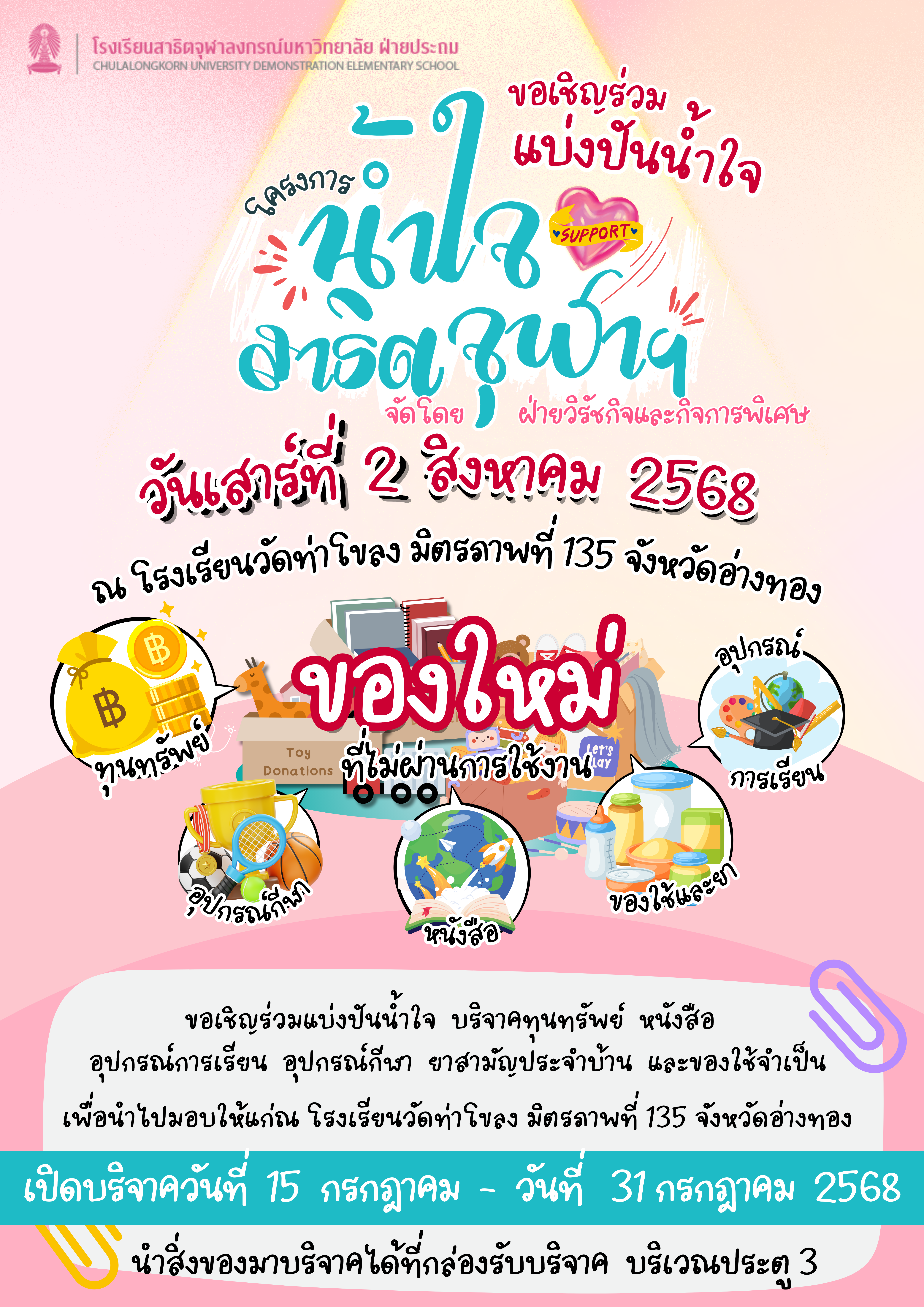 ขอเชิญชวนนักเรียน คณาจารย์ บุคลากร และผู้ปกครอง ร่วมแบ่งปันน้ำใจกับ “โครงการน้ำใจสาธิตจุฬาฯ ปีการศึกษา 2568” บริจาคทุนทรัพย์ หนังสือ อุปกรณ์การเรียน อุปกรณ์กีฬา ยาสามัญประจำบ้าน ของเล่นและของใช้ที่จำเป็น เพื่อนำไปมอบให้แก่โรงเรียนวัดท่าโขลง มิตรภาพที่ 135 จังหวัดอ่างทอง