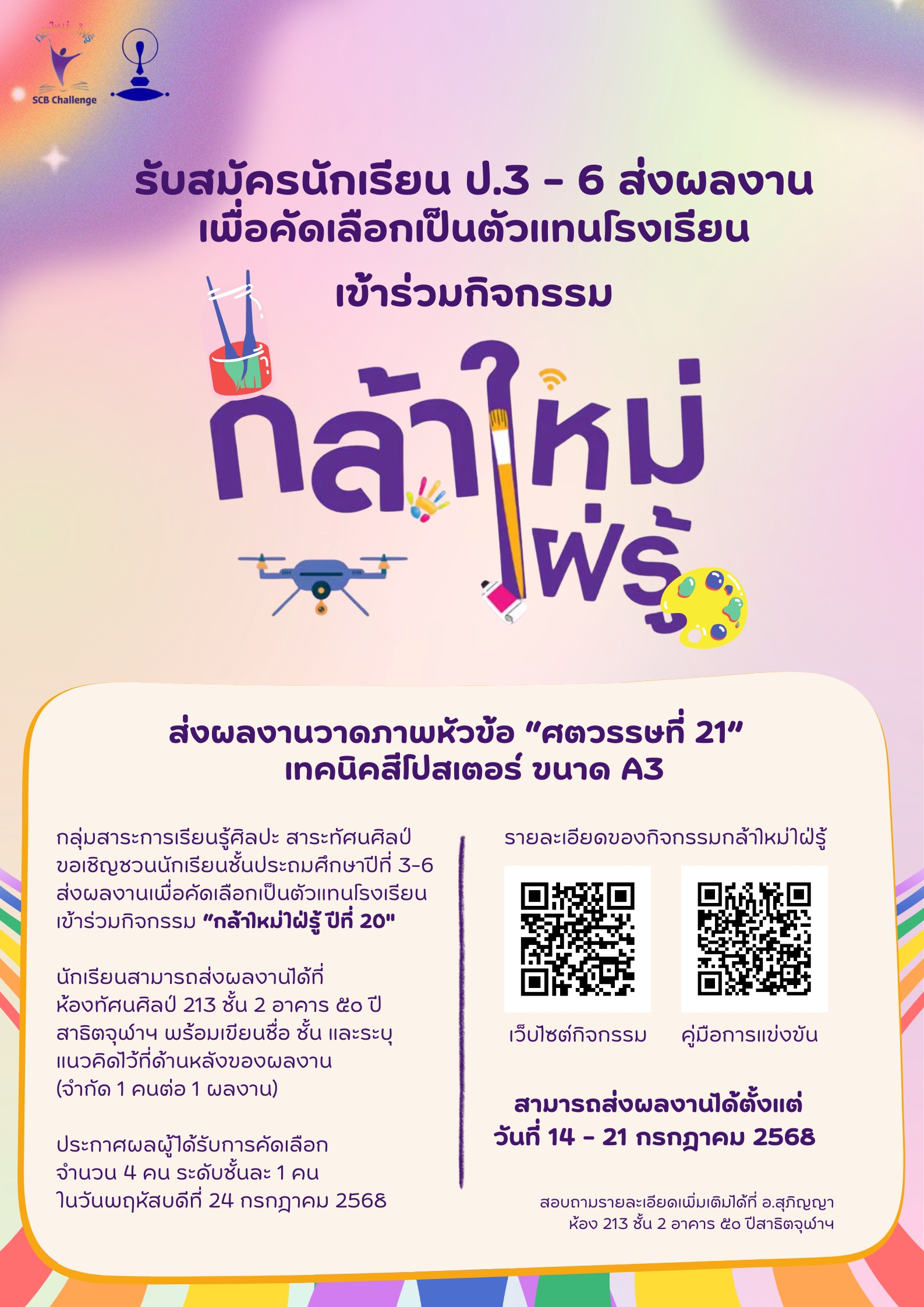 ขอเชิญชวนนักเรียนชั้นประถมศึกษาปีที่ 3 – 6 ร่วมส่งผลงานเพื่อคัดเลือกเป็นตัวแทนโรงเรียน เข้าร่วมกิจกรรม “กล้าใหม่ใฝ่รู้ ปีที่ 20”
