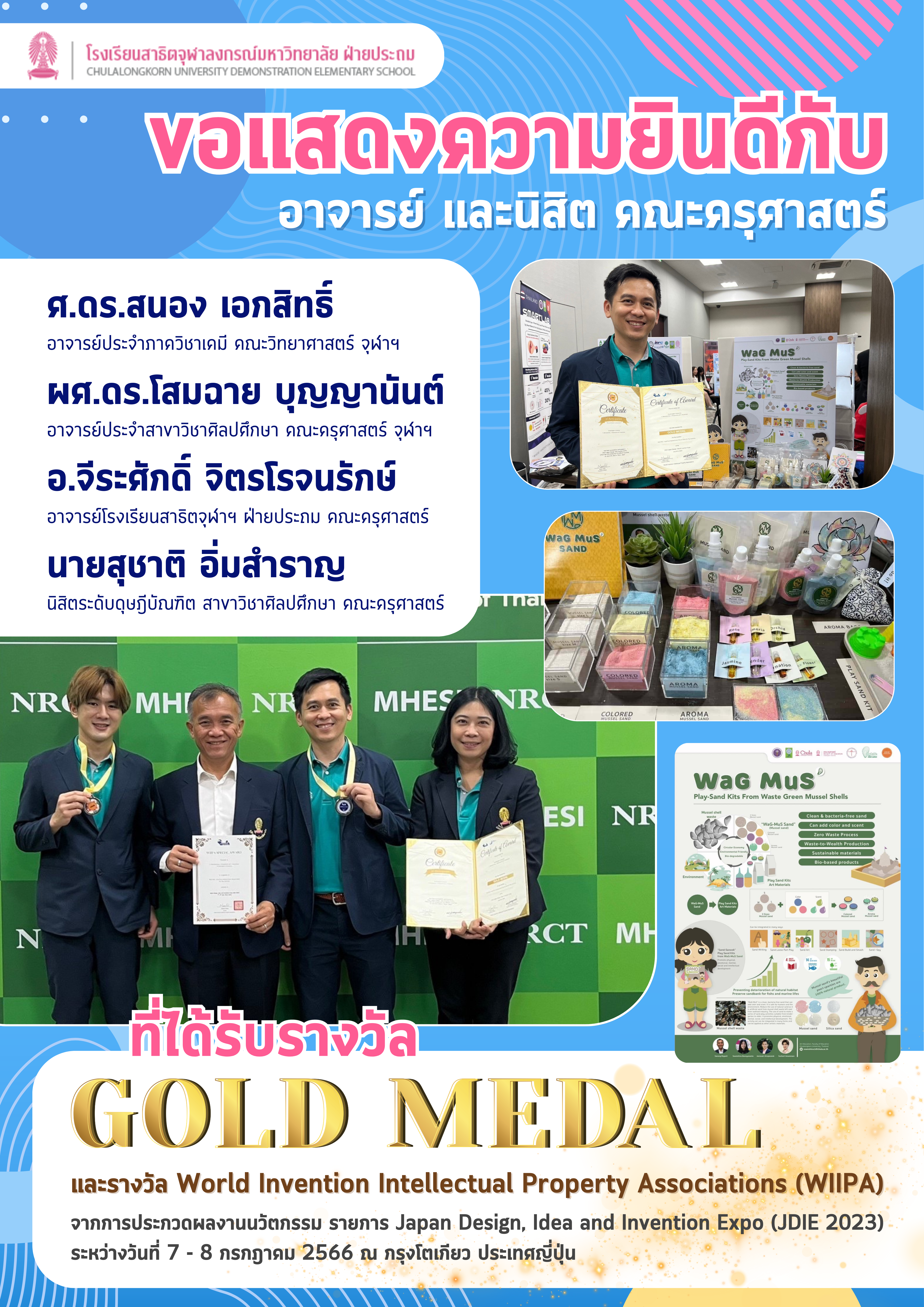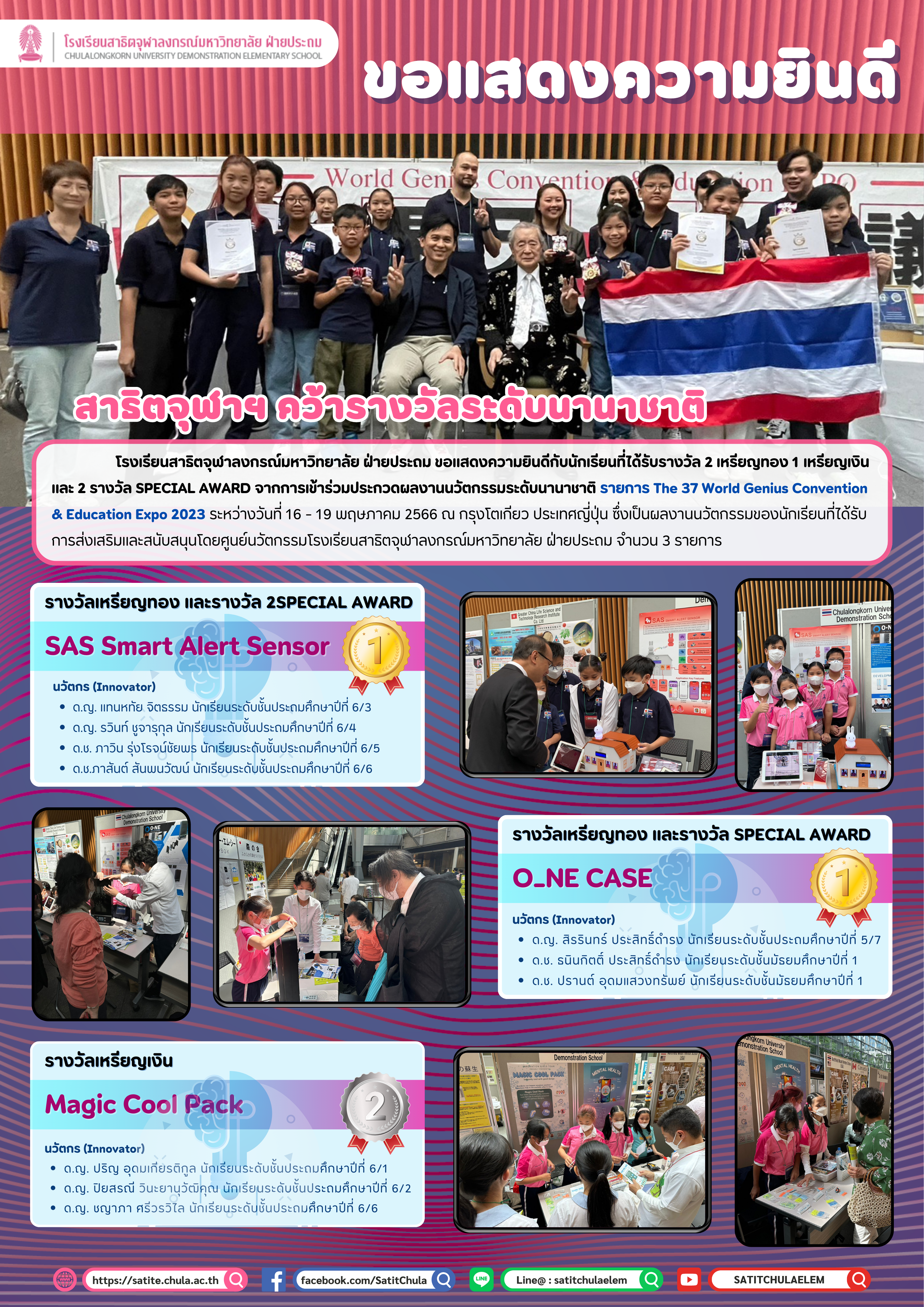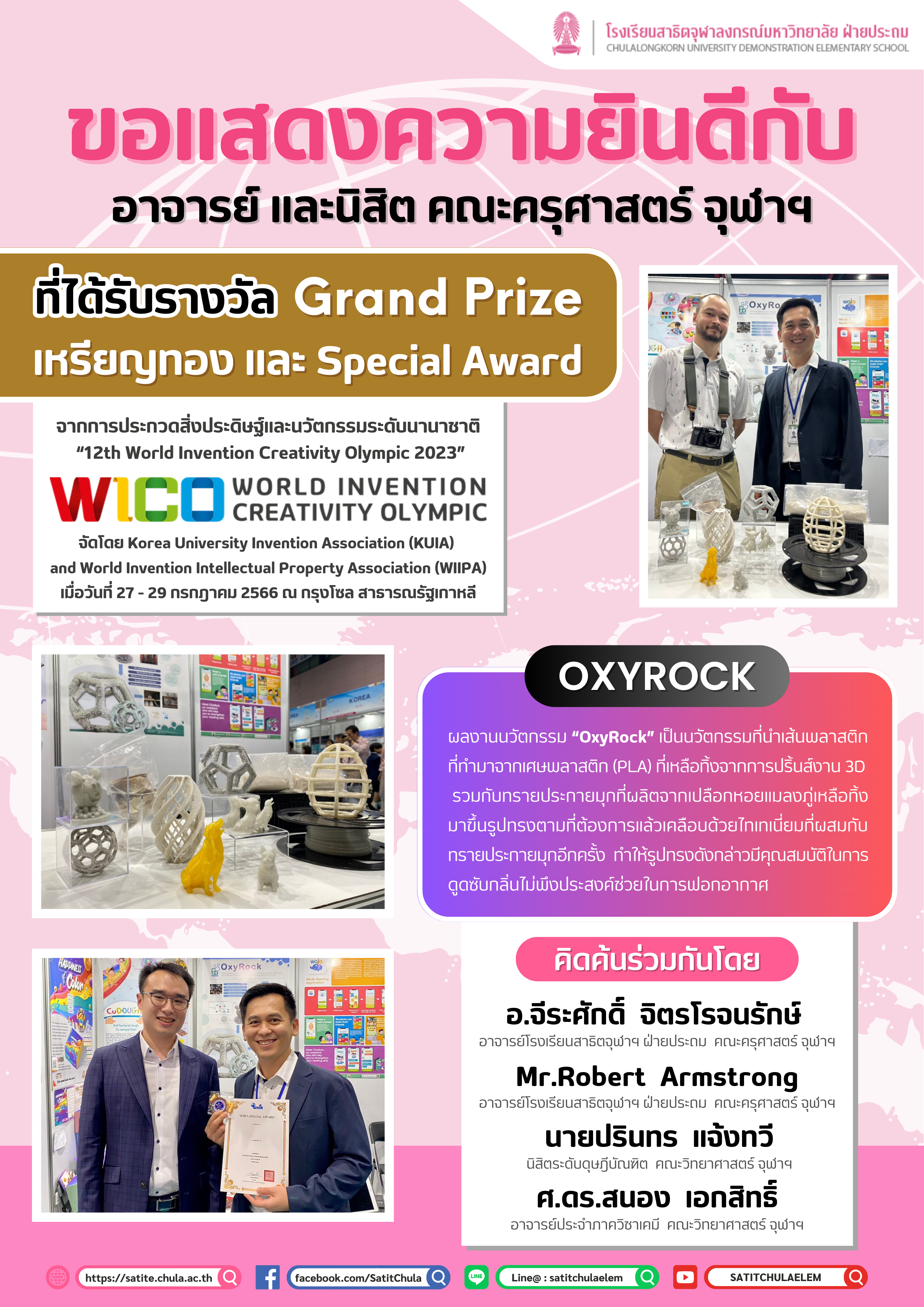 อาจารย์และนักเรียนโรงเรียนสาธิตจุฬาฯ ฝ่ายประถม คว้ารางวัล Grand Prize 2 รางวัล และรางวัลต่าง ๆ รวม 22 รางวัล จากการประกวดสิ่งประดิษฐ์และนวัตกรรมระดับนานาชาติ “12th World Invention Creativity Olympic 2023” จัดโดย Korea University Invention Association (KUIA) and World Invention Intellectual Property Association (WIIPA) เมื่อวันที่ 27 – 29 กรกฎาคม 2566 ณ SETEC กรุงโซล สาธารณรัฐเกาหลี