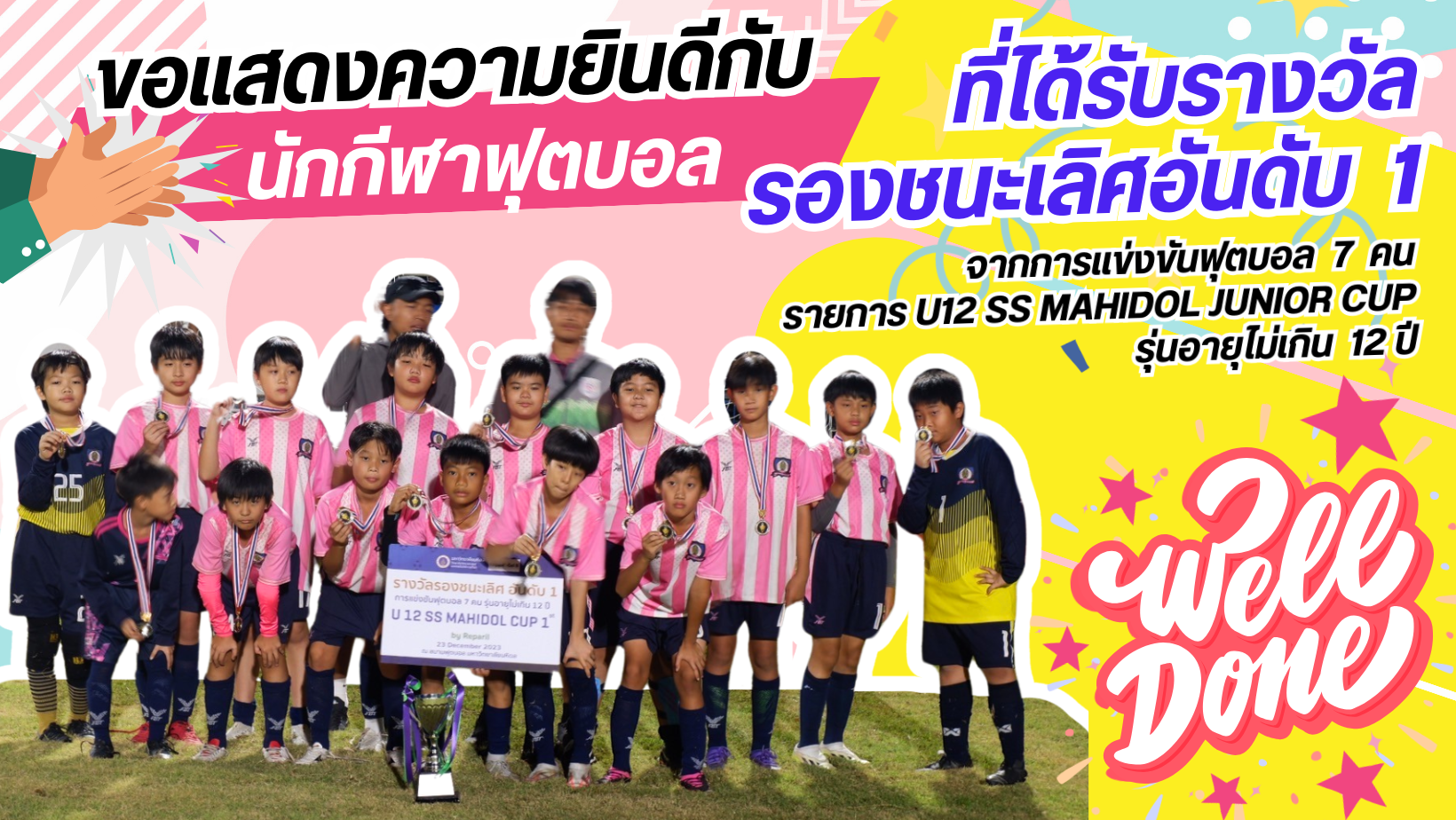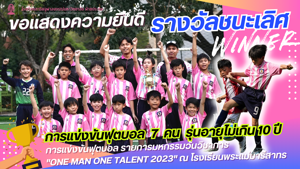 โรงเรียนสาธิตจุฬาลงกรณ์มหาวิทยาลัย ฝ่ายประถม ขอแสดงความยินดีกับนักกีฬาฟุตบอล โรงเรียนสาธิตจุฬาลงกรณ์มหาวิทยาลัย ฝ่ายประถม ได้รับรางวัลชนะเลิศ จากการแข่งขันฟุตบอล 7 คน รุ่นอายุไม่เกิน 10 ปี การแข่งขันฟุตบอลรายการ มหกรรมวิชาการ ครั้งที่ 7 “ONE MAN ONE TALENT 2023” ณ โรงเรียนพระแม่มารีสาทร