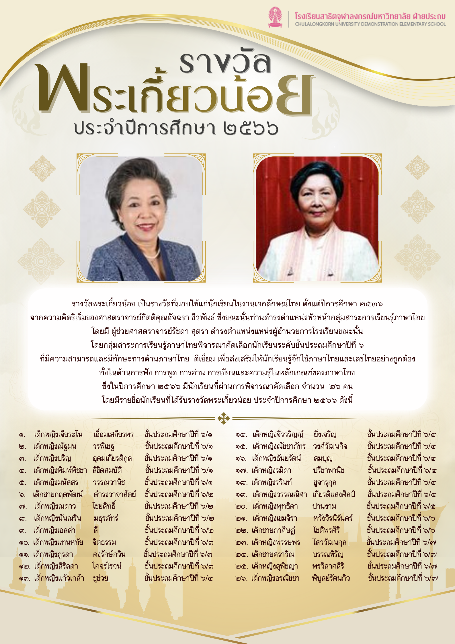 นักเรียนที่ได้รับรางวัลพระเกี้ยวน้อย ประจำปีการศึกษา 2566