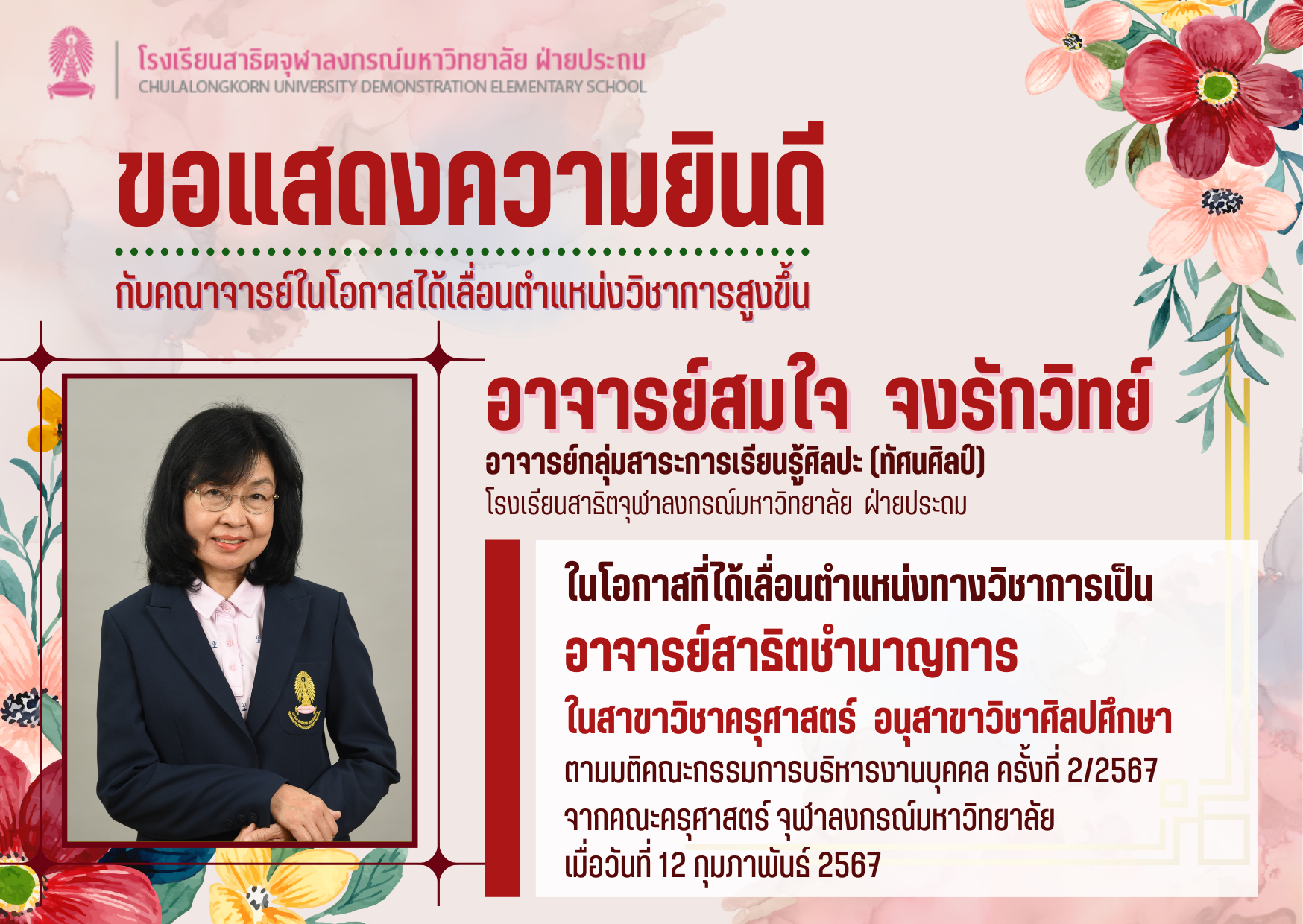 โรงเรียนสาธิตจุฬาลงกรณ์มหาวิทยาลัย ฝ่ายประถม ขอแสดงความยินดีกับ อาจารย์สมใจ จงรักวิทย์ อาจารย์กลุ่มสาระการเรียนรู้ศิลปะ (ทัศนศิลป์) ในโอกาสที่ได้เลื่อนตำแหน่งทางวิชาการเป็นอาจารย์สาธิตชำนาญการ สาขาวิชาครุศาสตร์อนุสาขาวิชาศิลปศึกษา ตามมติคณะกรรมการบริหารงานบุคคล [...]