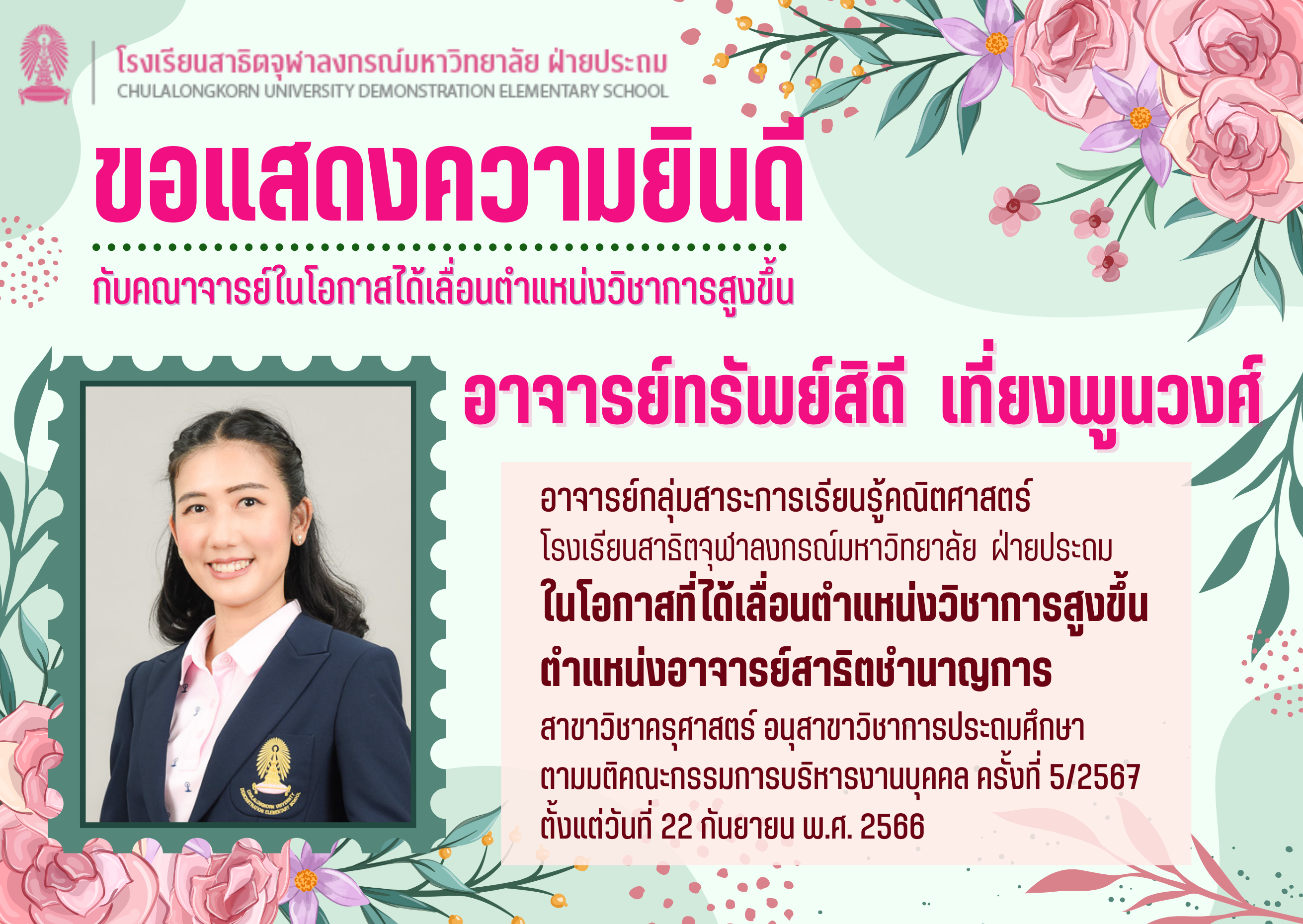 ขอแสดงความยินดีกับอาจารย์ในโอกาสที่ได้เลื่อนตำแหน่งทางวิชาการเป็นอาจารย์สาธิตชำนาญการ
