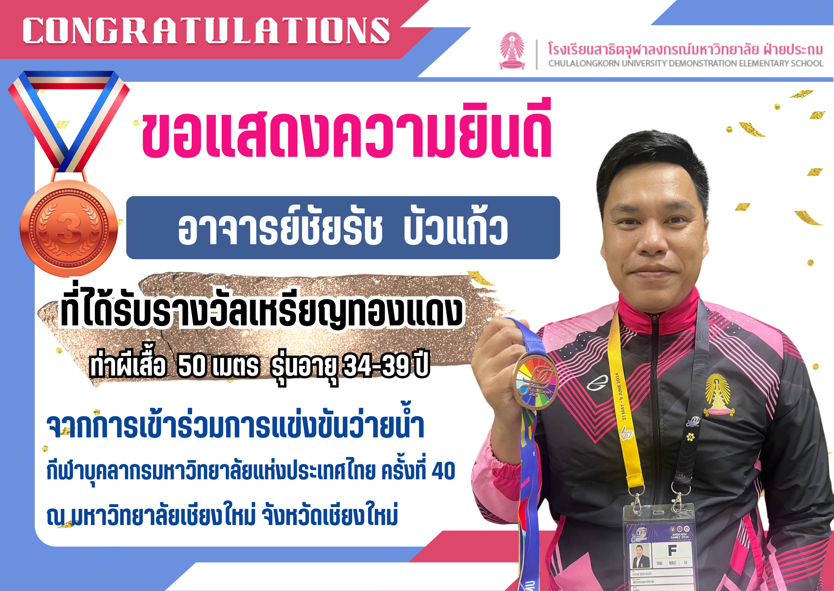 ขอแสดงความยินดีกับ อาจารย์ชัยรัช บัวแก้ว ที่ได้รับรางวัลเหรียญทองแดง จากการเข้าร่วมการแข่งขันว่ายน้ำ ท่าผีเสื้อ 50 เมตร รุ่นอายุ 34-39 ปี กีฬาบุคลากรมหาวิทยาลัยแห่งประเทศไทย ครั้งที่ 40 “อ่างแก้วเกมส์”