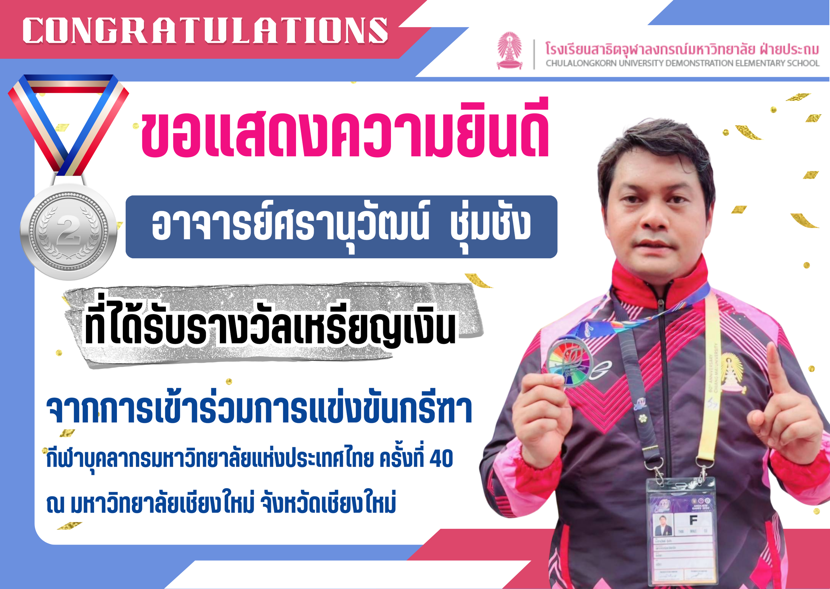 ขอแสดงความยินดีกับ อาจารย์ศรานุวัฒน์ ชุ่มชัง ที่ได้รับรางวัลเหรียญเงิน จากการเข้าร่วมการแข่งขันกรีฑา กีฬาบุคลากรมหาวิทยาลัยแห่งประเทศไทย ครั้งที่ 40 “อ่างแก้วเกมส์”