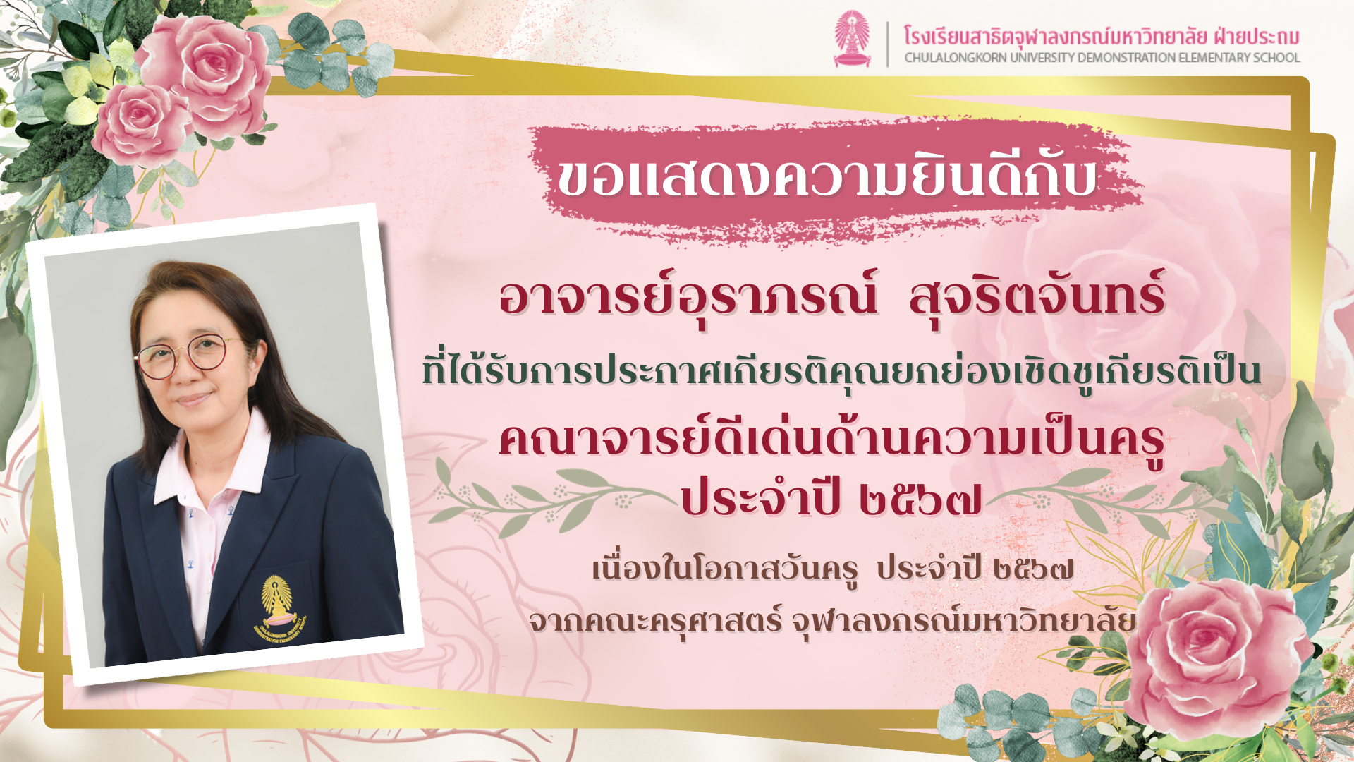 โรงเรียนสาธิตจุฬาลงกรณ์มหาวิทยาลัย ฝ่ายประถม ขอแสดงความยินดีกับ อาจารย์พรพิมล ศิริวัฒน์ ที่ได้รับการประกาศเกียรติคุณยกย่องเชิดชูเกียรติเป็น คณาจารย์อาวุโส ประจำปี 2567 เนื่องในโอกาสวันครู ประจำปี 2567 จากคณะครุศาสตร์ จุฬาลงกรณ์มหาวิทยาลัย