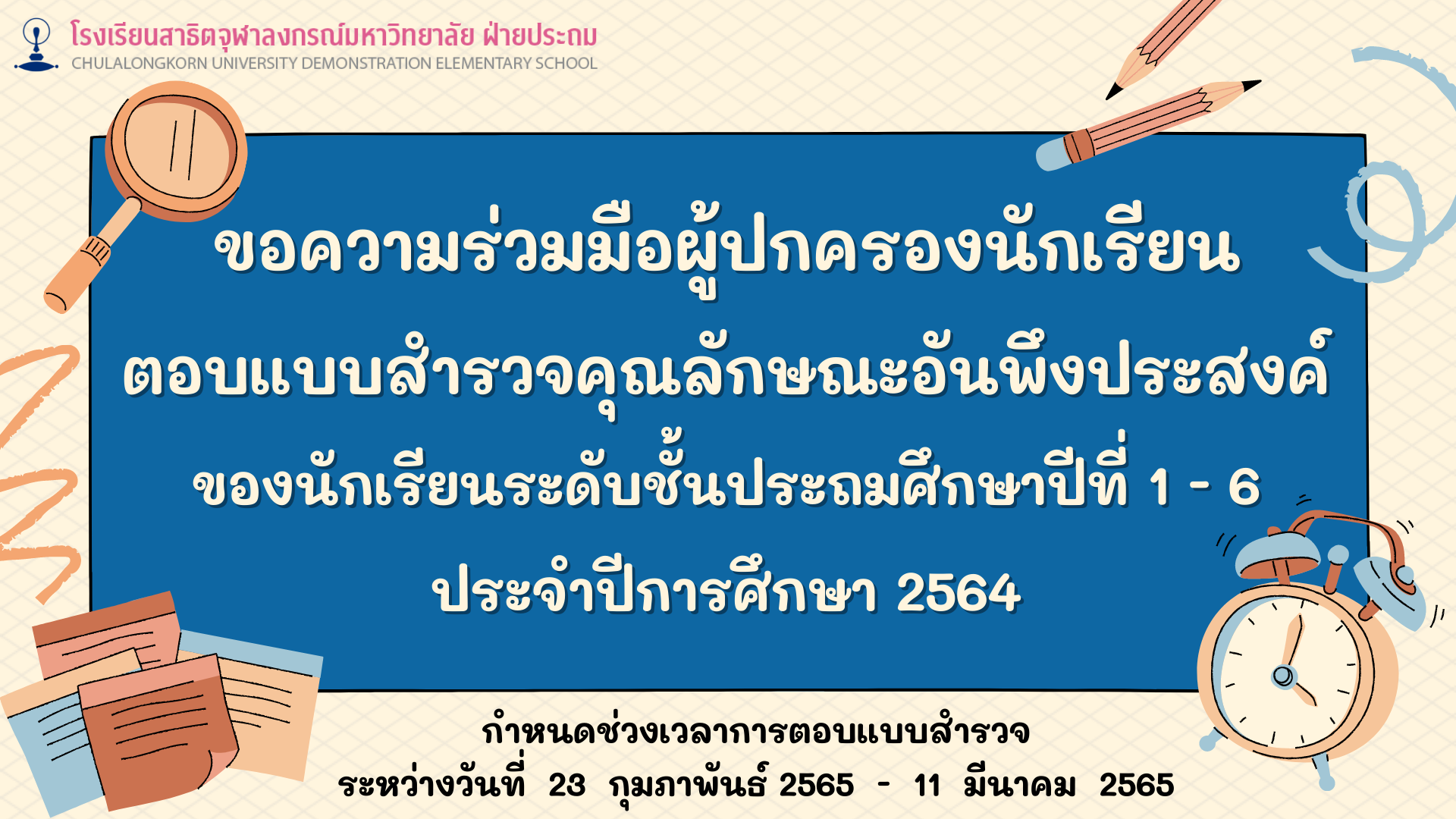 โรงเรียนสาธิตจุฬาลงกรณ์มหาวิทยาลัย ฝ่ายประถม ขอความร่วมมือจากท่านผู้ปกครองตอบแบบสำรวจคุณลักษณะอันพึงประสงค์ของนักเรียนในความดูแลของท่าน เพื่อนำข้อมูลมาใช้สำหรับการตรวจติดตามการประกันคุณภาพภายในสถานศึกษา ปีการศึกษา 2564 ทั้งนี้ข้อมูลในส่วนนี้โรงเรียนจะเก็บเป็นความลับ และไม่มีผลใด ๆ ต่อการประเมินผลสัมฤทธิ์ทางการเรียนของนักเรียน จึงขอความร่วมมือผู้ปกครองตอบแบบสำรวจคุณลักษณะอันพึงประสงค์ของนักเรียน ระหว่างวันที่ 23 กุมภาพันธ์ 2565 – 11 มีนาคม 2565
