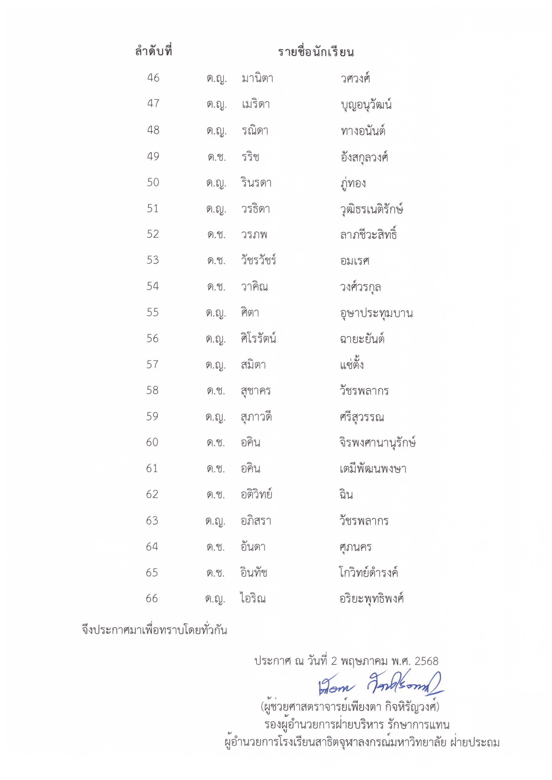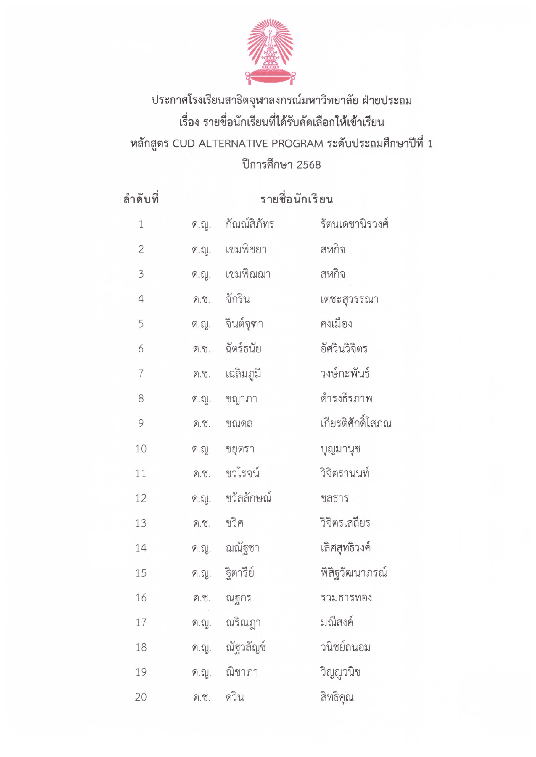 ประกาศรายชื่อนักเรียนที่ได้รับคัดเลือกให้เข้าเรียนหลักสูตร CUD ALTERNATIVE PROGRAM ระดับประถมศึกษาปีที่ 1 ปีการศึกษา 2568 โรงเรียนสาธิตจุฬาลงกรณ์มหาวิทยาลัย ฝ่ายประถม By Web Master|2025-08-25T18:06:08+07:00May 2, 2025|ข่าวประชาสัมพันธ์, เรื่องแจ้งจากฝ่ายหลักสูตรและการสอน| View Larger Image