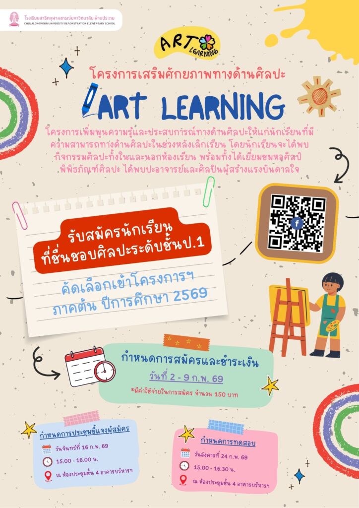 โครงการเสริมศักยภาพทางด้านศิลปะ Art Learning Satit Chula เปิดรับสมัครนักเรียนชั้นประถมศึกษาปีที่ 1 ปีการศึกษา 2568 ที่มีความสนใจทางด้านศิลปะ เพื่อคัดเลือกเข้าร่วมโครงการ Art Learning ภาคต้น ปีการศึกษา 2569