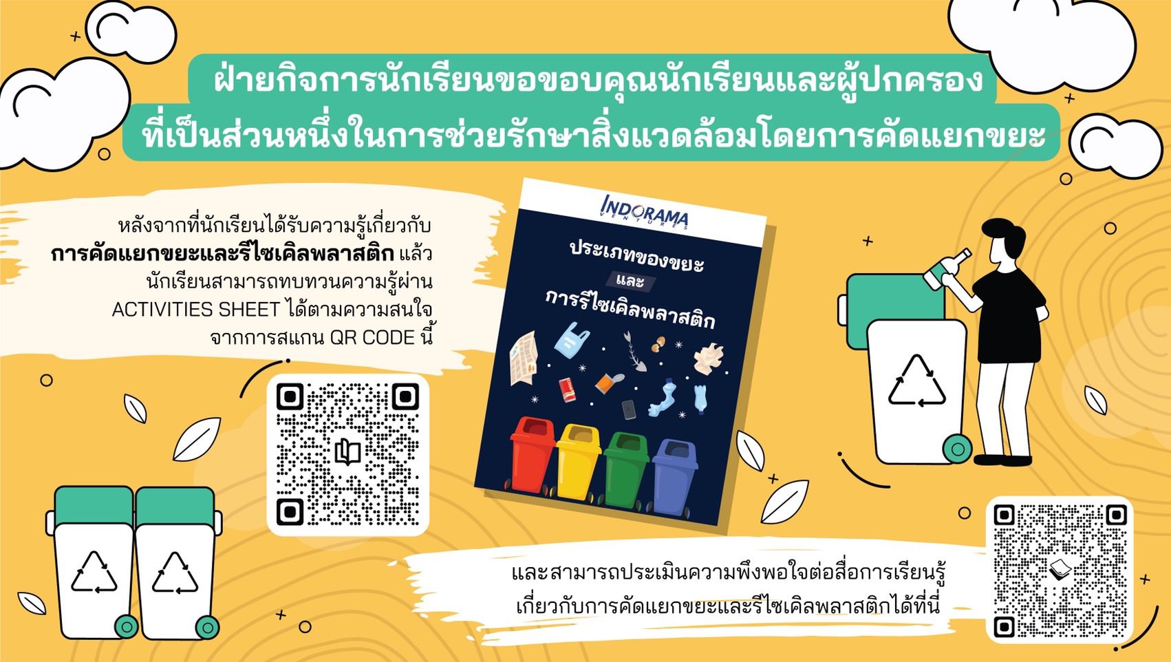 หลังจากที่นักเรียนได้รับความรู้เกี่ยวกับการคัดแยกขยะและรีไซเคิลพลาสติกแล้ว นักเรียนสามารถทบทวนความรู้ผ่าน Activities Sheet ได้ตามความสนใจจากการสแกน QR Code หรือคลิกลิงก์นี้