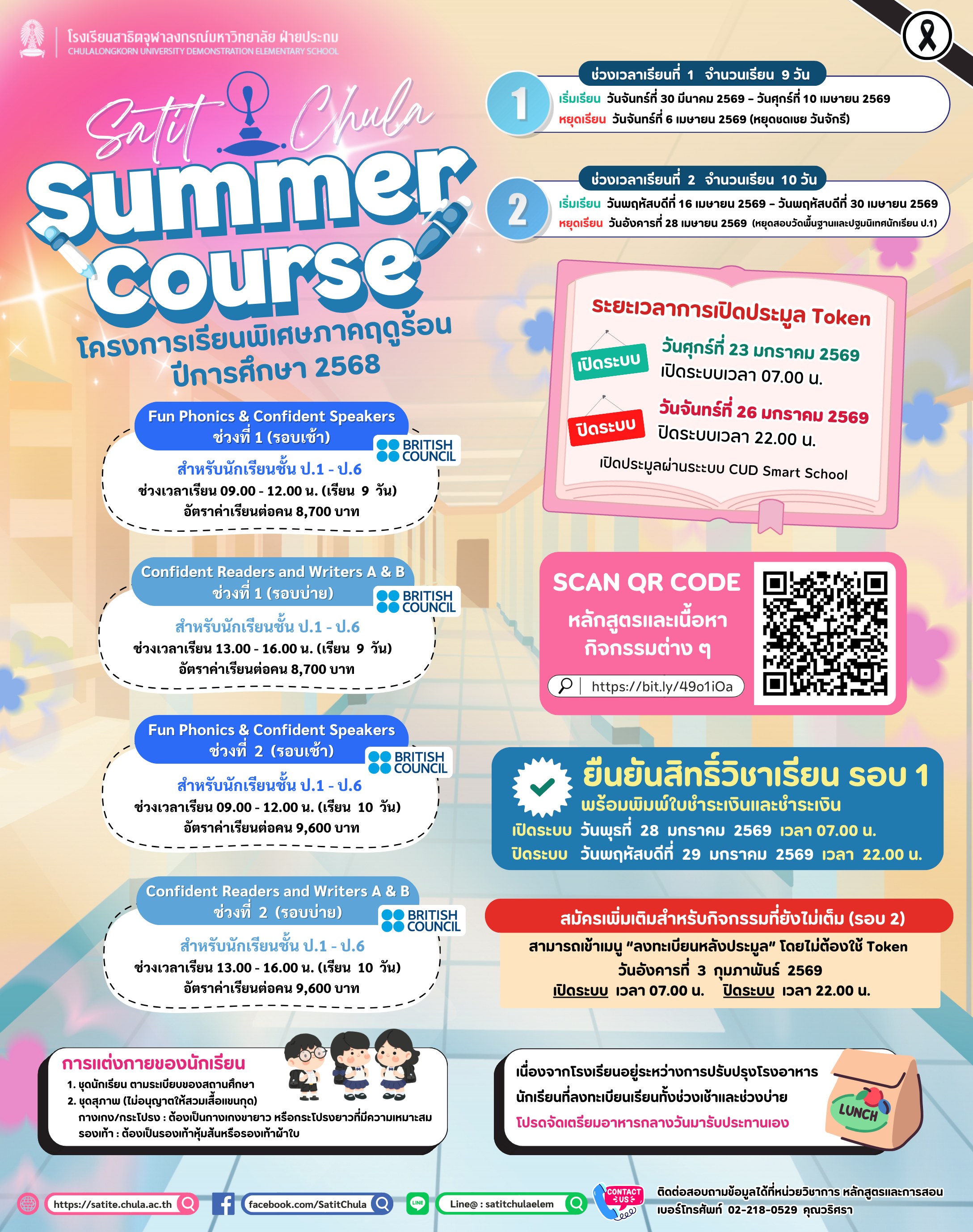 โรงเรียนสาธิตจุฬาลงกรณ์มหาวิทยาลัย ฝ่ายประถม ขอเชิญชวนนักเรียนระดับชั้นประถมศึกษาปีที่ 1 – 6 สมัครเข้าร่วมโครงการเรียนพิเศษ ภาคฤดูร้อน ปีการศึกษา 2568 โดยมีรายละเอียด ดังนี้