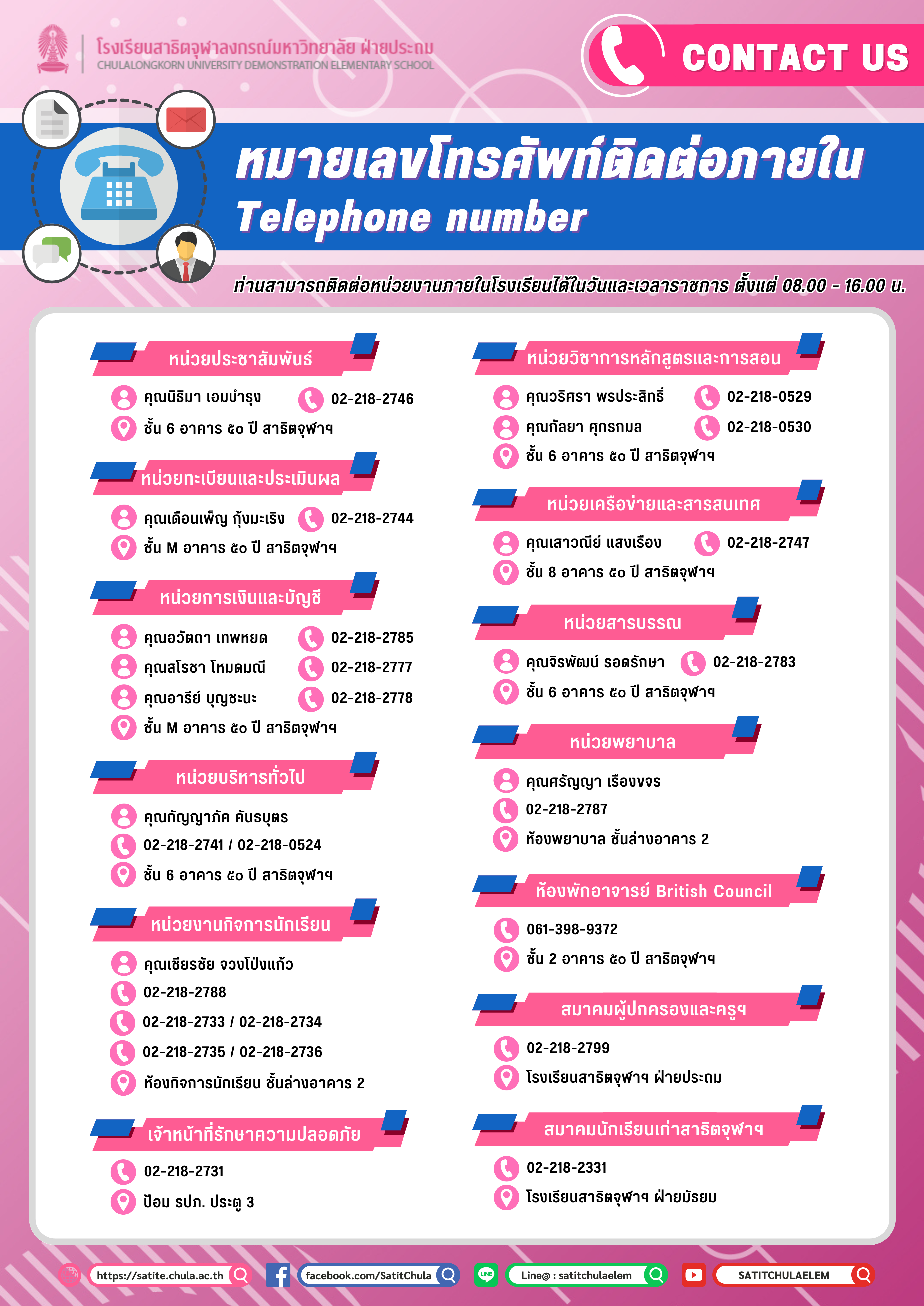 หมายเลขโทรศัพท์ติดต่อภายใน โรงเรียนสาธิตจุฬาลงกรณ์มหาวิทยาลัย ฝ่ายประถม ท่านสามารถติดต่อหน่วยงานภายในโรงเรียน ได้ในวันและเวลาราชการ ตั้งแต่ 08.00 – 16.00 น. By Web Master|2023-05-30T12:53:10+07:00May 30, 2023|ข่าวประชาสัมพันธ์| View Larger Image