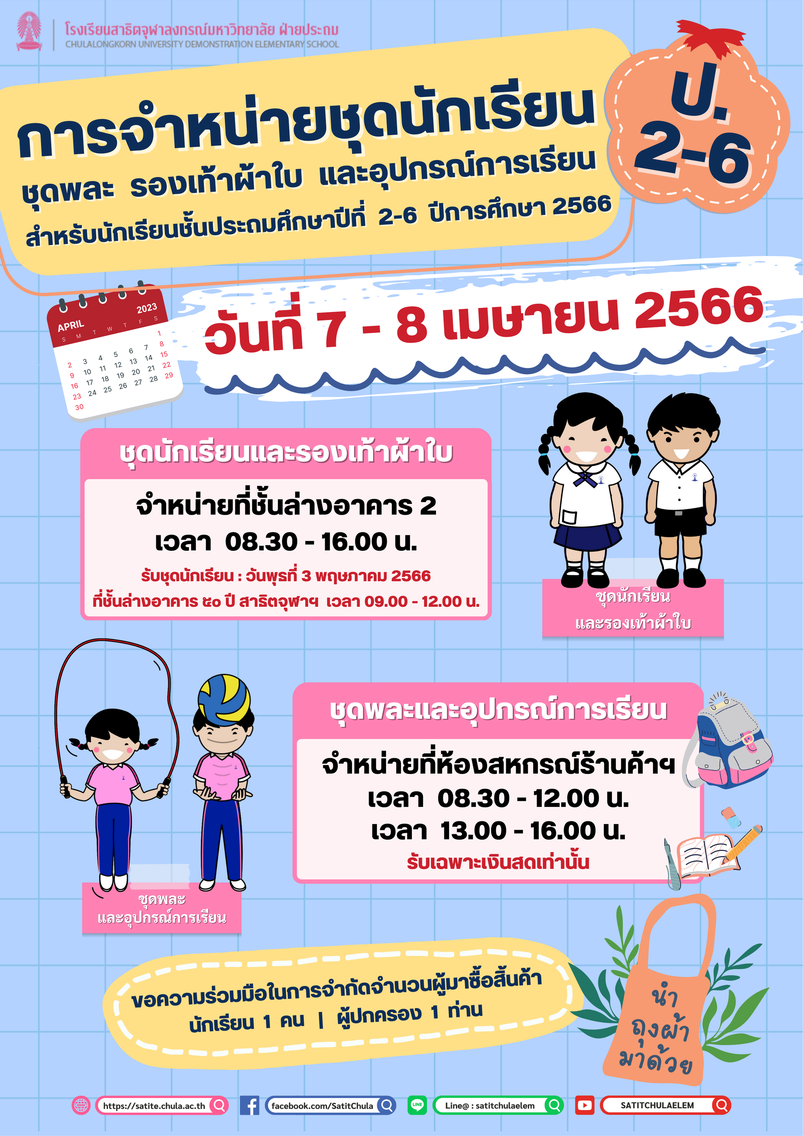 รับชุดนักเรียน : วันพุธที่ 3 พฤษภาคม 2566 ที่ชั้นล่างอาคาร ๕๐ ปี สาธิตจุฬาฯ เวลา 09.00 – 12.00 น.