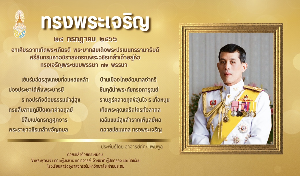 28 กรกฎาคม วันเฉลิมพระชนมพรรษา พระบาทสมเด็จพระปรเมนทรรามาธิบดีศรีสินทรมหาวชิราลงกรณ พระวชิรเกล้าเจ้าอยู่หัว (28 กรกฎาคม 2566) By Web Master|2023-07-28T00:27:10+07:00July 28, 2023|ข่าวประชาสัมพันธ์|