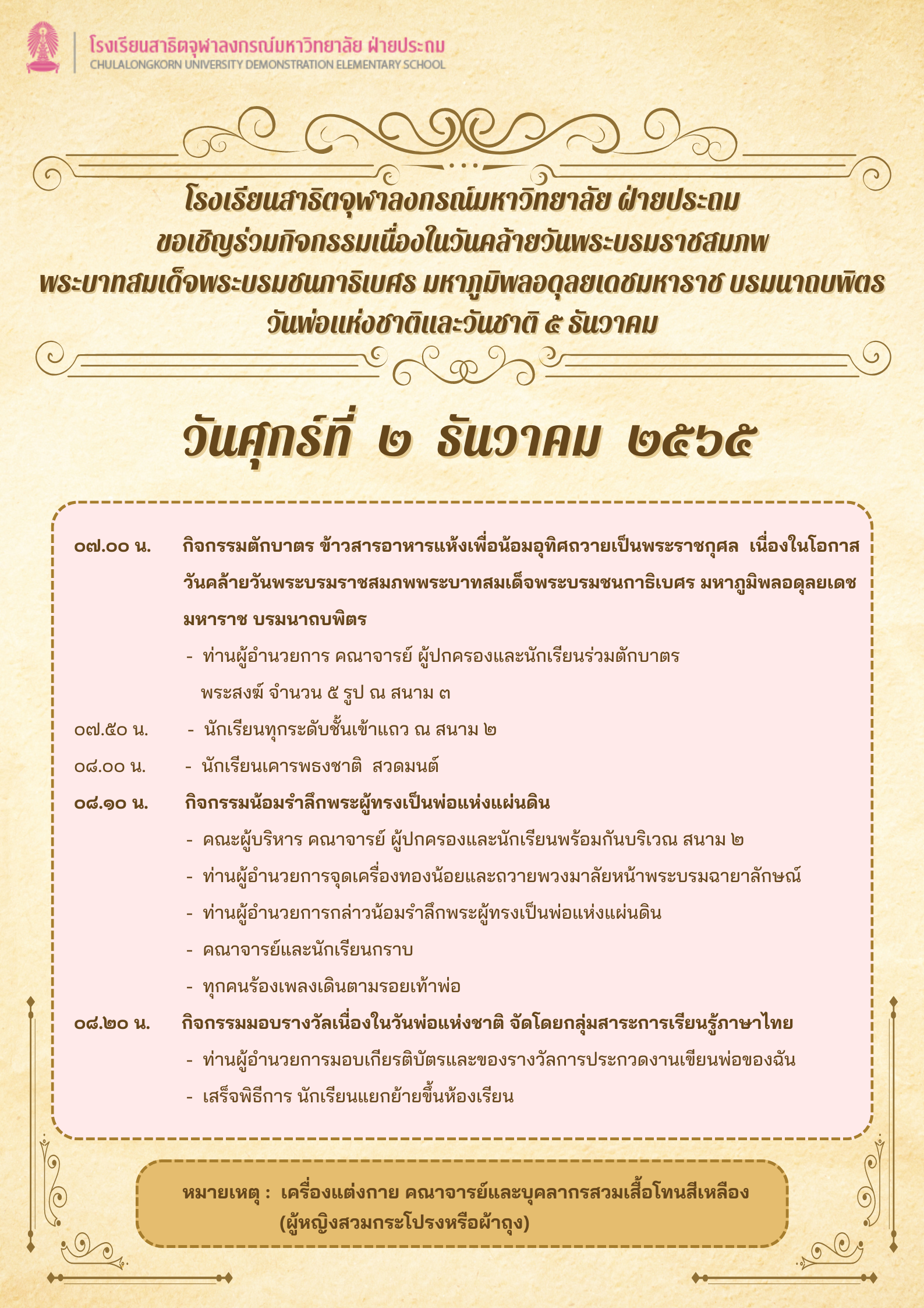 โรงเรียนสาธิตจุฬาลงกรณ์มหาวิทยาลัย ฝ่ายประถม ขอเชิญคณาจารย์ บุคลากร และผู้ปกครอง ร่วมกิจกรรมเนื่องในวันคล้ายวันพระบรมราชสมภพ พระบาทสมเด็จพระบรมชนกาธิเบศร มหาภูมิพลอดุลยเดชมหาราช บรมนาถบพิตร วันพ่อแห่งชาติและวันชาติ